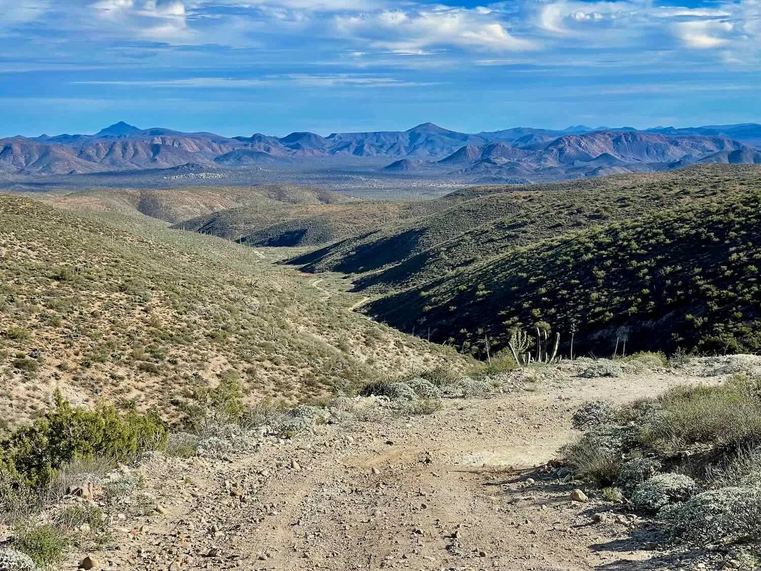 Climbing up into the Baja desert mountains. The San Quintín Valley and Pacific Ocean can be seen in the distance. Cerro de San Miguel, Baja California, Mexico. Copyright © 2019-2023 Pedals and Puffins.