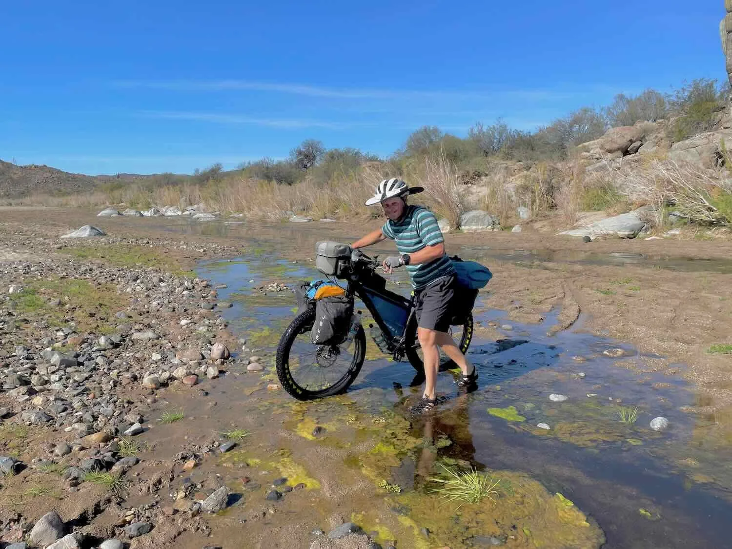 But luck was with us. Less than 10 minutes into our ride, we passed a grove of trees in an arroyo. There was a cattle corral under the trees. And seeing the trees reminded us that we had heard frogs calling during the night (which seemed odd, in the desert). Pretty quickly, we reached the conclusion that this would be a good place to look for water. We grabbed a couple of bottles, our water filter, and some chlorine tablets and headed across the corral to investigate.