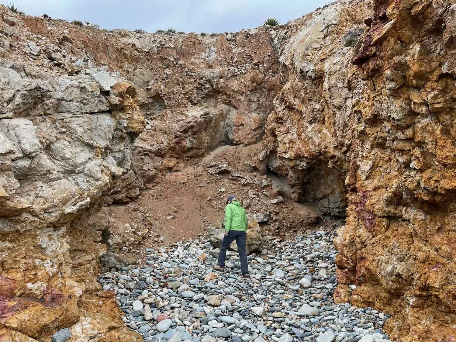 Cobblestones washed up to fill the floor of a cove carved into the cliff. Punta Lobos, Baja California, Mexico. Copyright © 2019-2023 Pedals and Puffins.