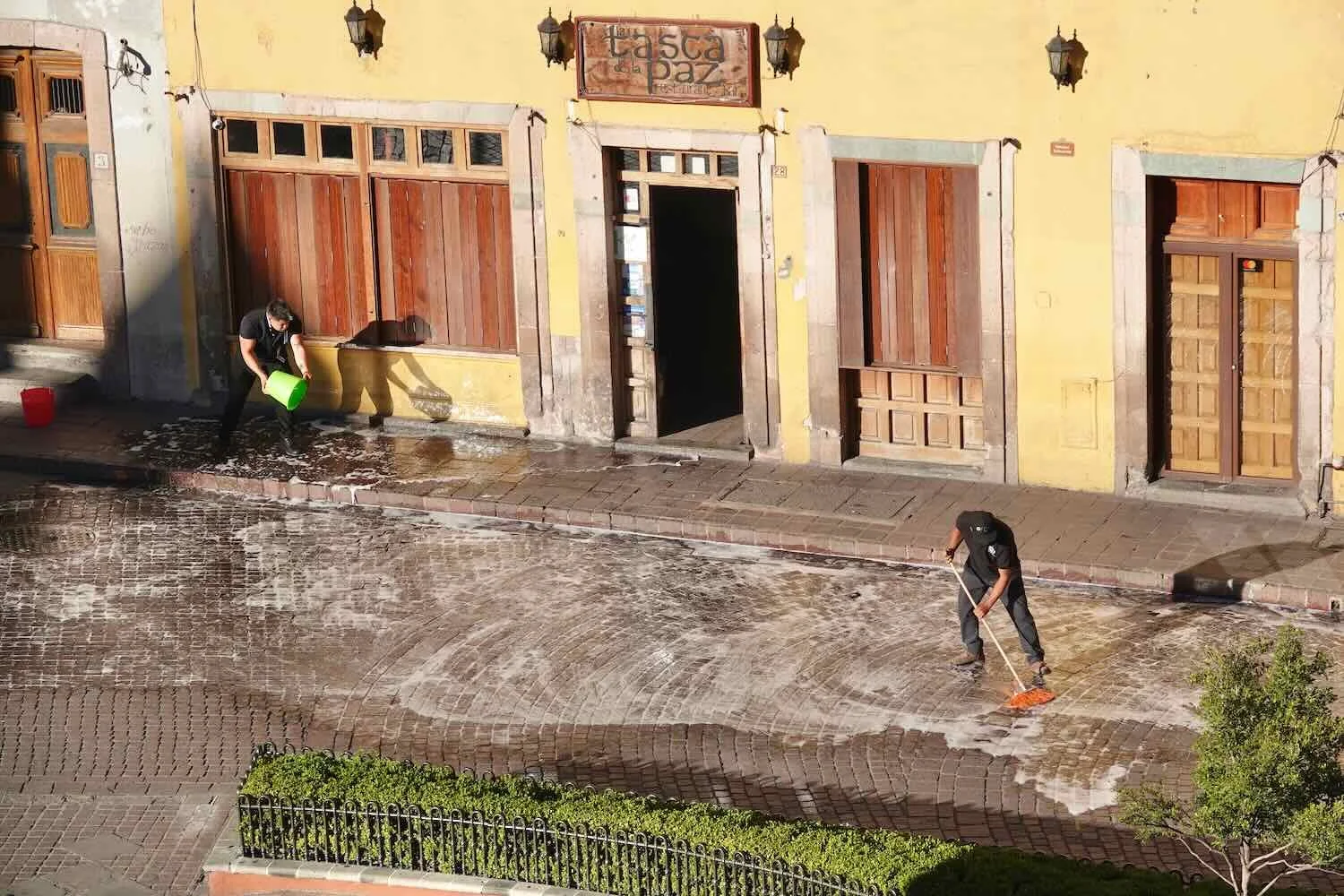 Workers scrub the cobblestone streets each morning to prep the Plaza de la Paz for a new day. City of Guanajuato, Mexico. Copyright © 2019-2023 Pedals and Puffins.