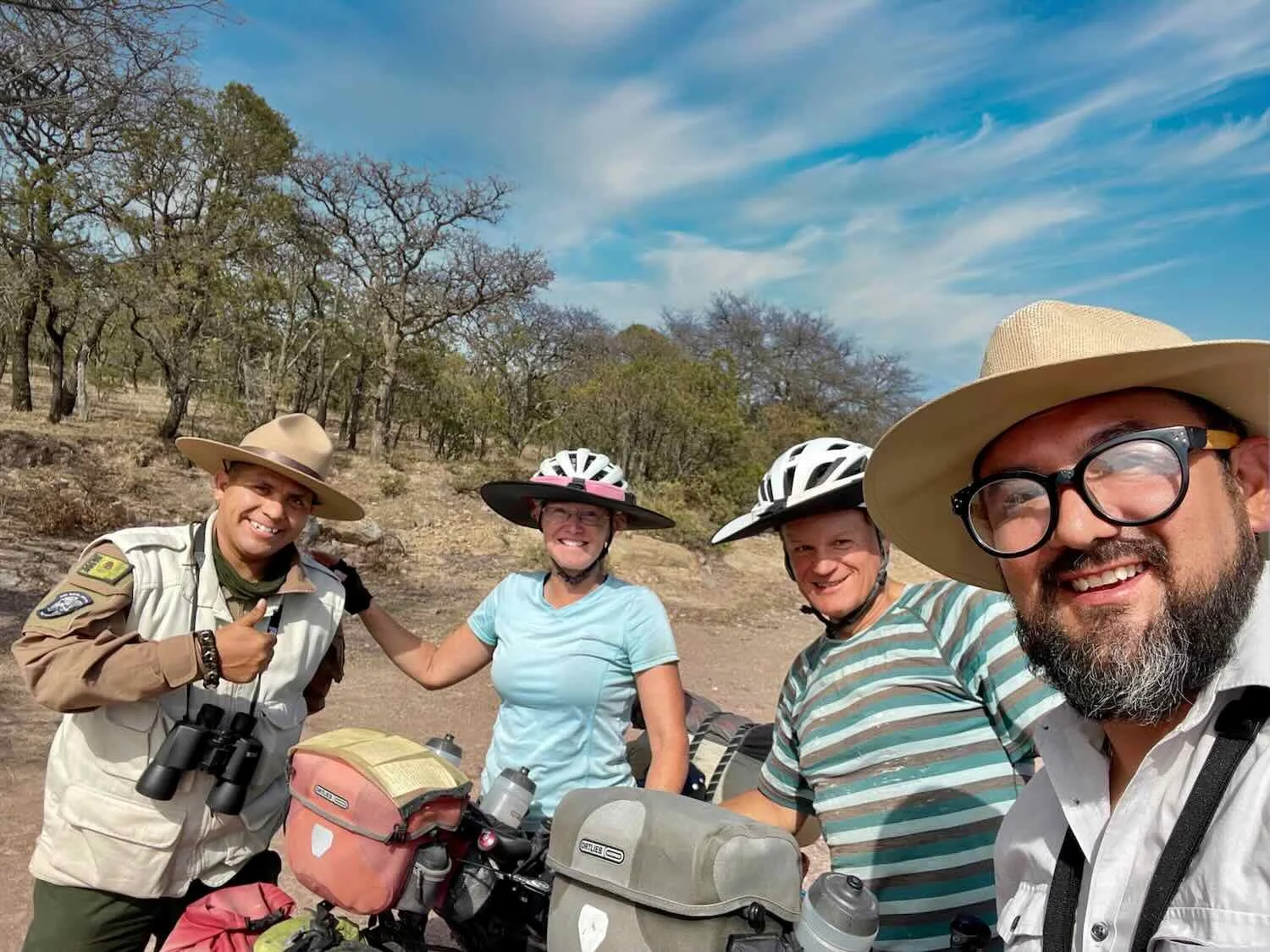 Getting the scoop on where we might be able to camp from forest rangers, Amilcar (left) and Jaime (right). Sierra Fría Natural Resource Protection Area, State of Aguascalientes, Mexico. Copyright © 2019-2023 Pedals and Puffins.