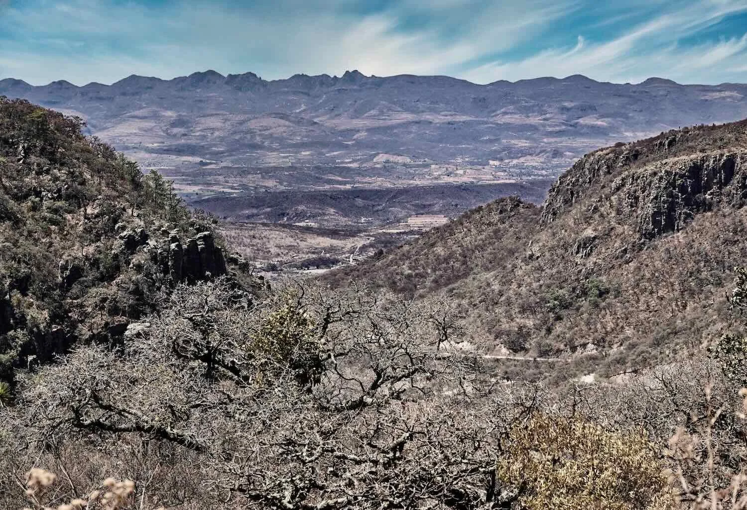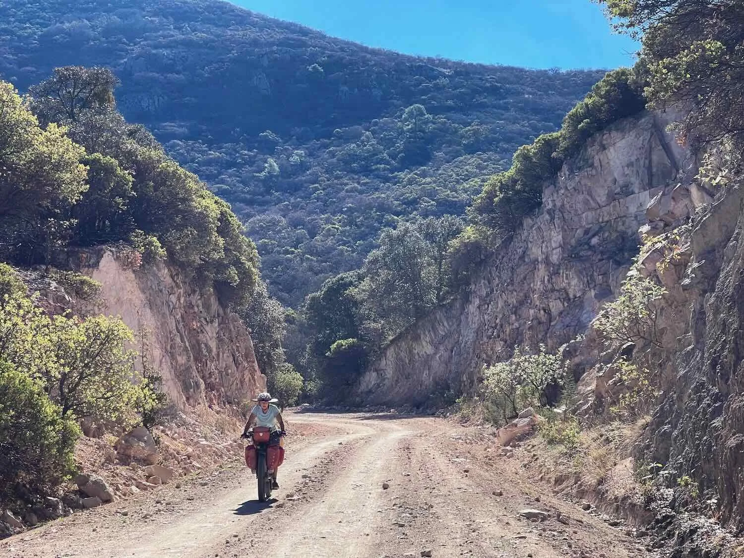 Our route descended out of the heights of the Sierra Fría mountains on a gravel road through a steep canyon. Approaching Temazcal, State of Aguascalientes, Mexico. Copyright © 2019-2023 Pedals and Puffins.