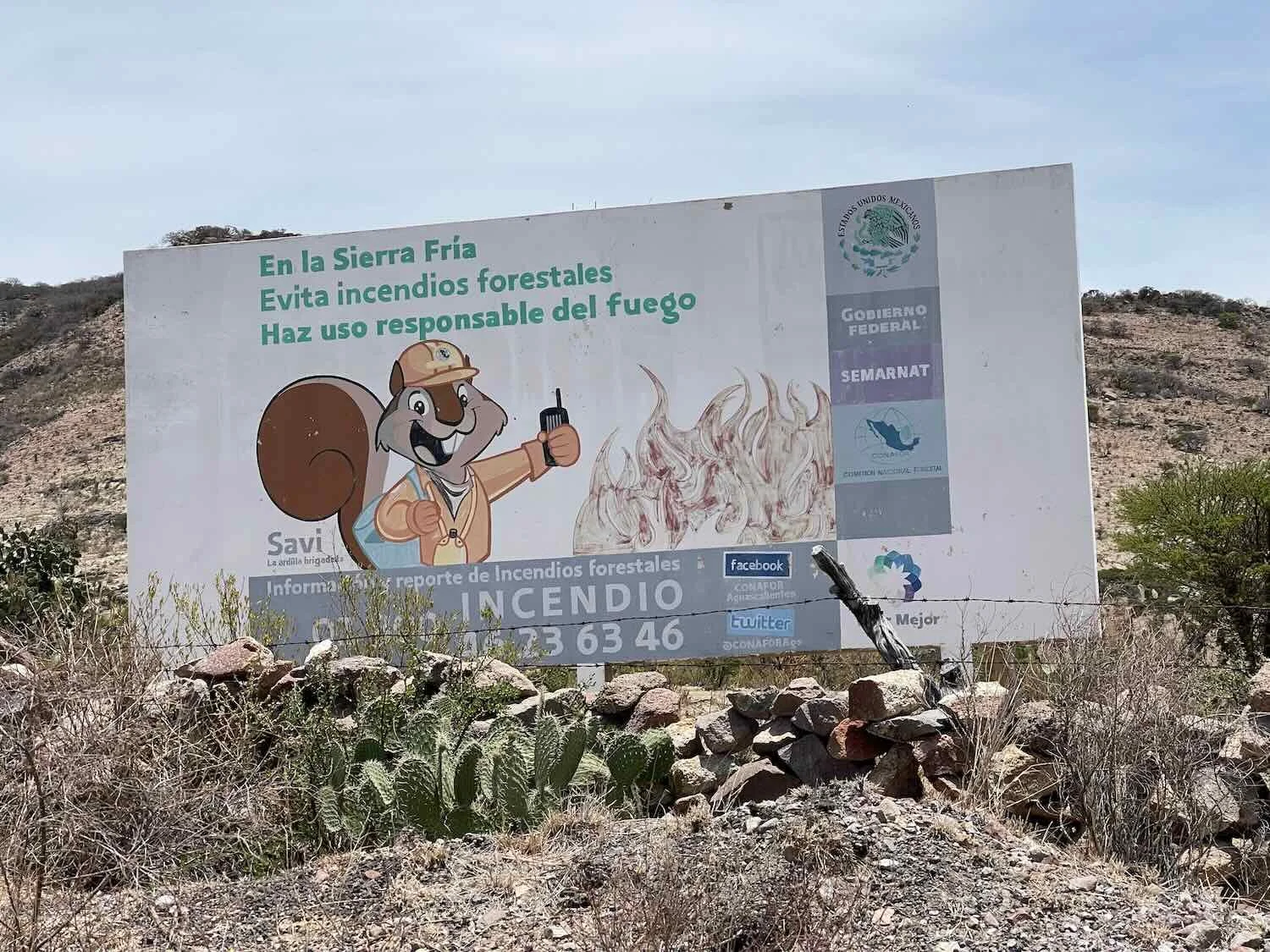 Although there isn’t much vegetation here, wildfires can still burn through the dry brush, grasslands, and higher elevation forests. Savi, the Fire Brigade Squirrel, encourages people to prevent forest fires (just like his northern colleague, Smoky the Bear). West of San Antonio de los Ríos, State of Aguascalientes, Mexico. Copyright © 2019-2023 Pedals and Puffins.
