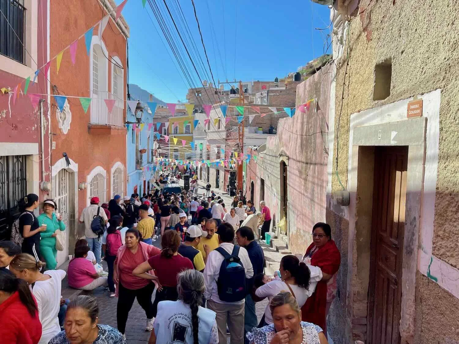 A crowd was gathered on one of the narrow streets, quietly sharing food and drinks on a cool morning. We were offered a cup of horchata (rice milk) from one of the folks serving drinks from a tray. City of Guanajuato, Mexico. City of Guanajuato, Mexico. Copyright © 2019-2023 Pedals and Puffins.