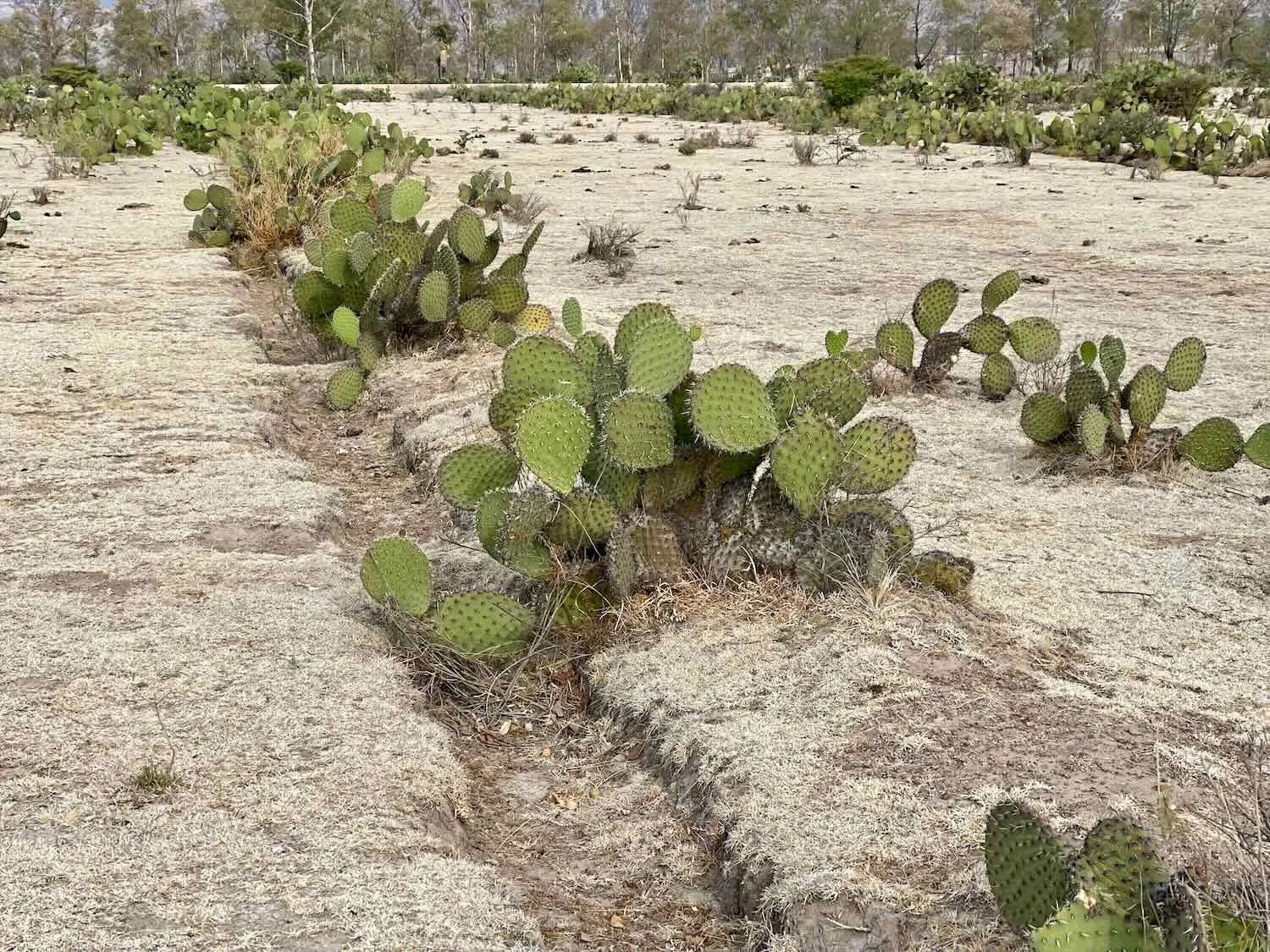Rows of prickly pear cactus (nopales), the most popular crop in these arid farmlands. Approaching La Camada, State of Aguascalientes, Mexico. Copyright © 2019-2023 Pedals and Puffins.