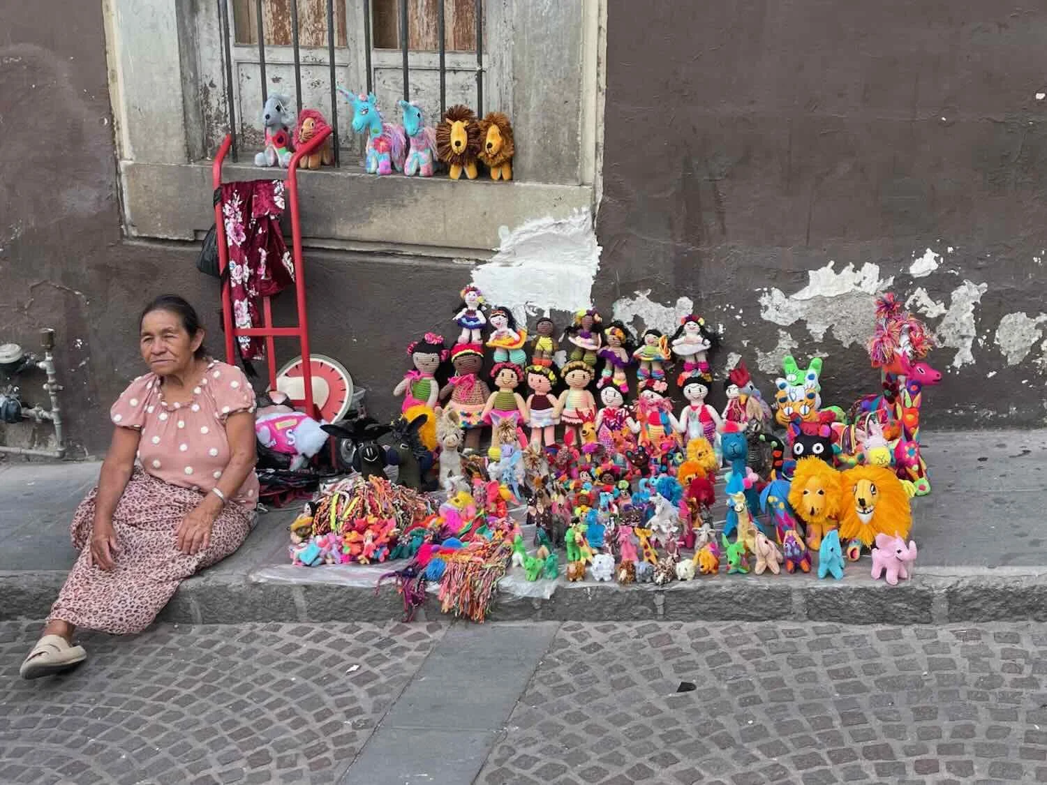 A toy vendor with her colorful merchandise. City of Guanajuato, Mexico. Copyright © 2019-2023 Pedals and Puffins.