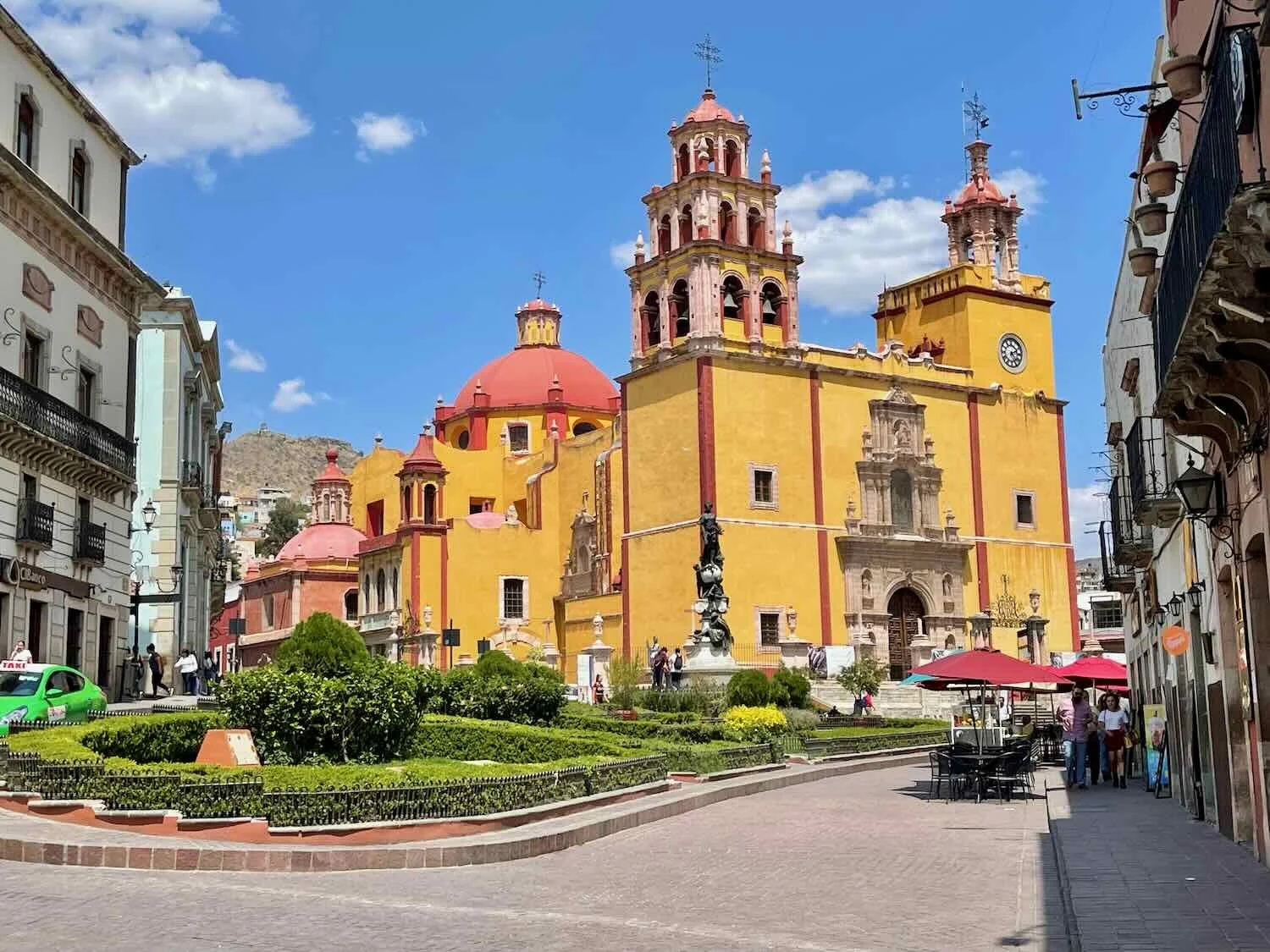 The colorful and elegant Cathedral of Guanajuato anchors one side of the central Plaza de la Paz. City of Guanajuato, Mexico. Copyright © 2019-2023 Pedals and Puffins.