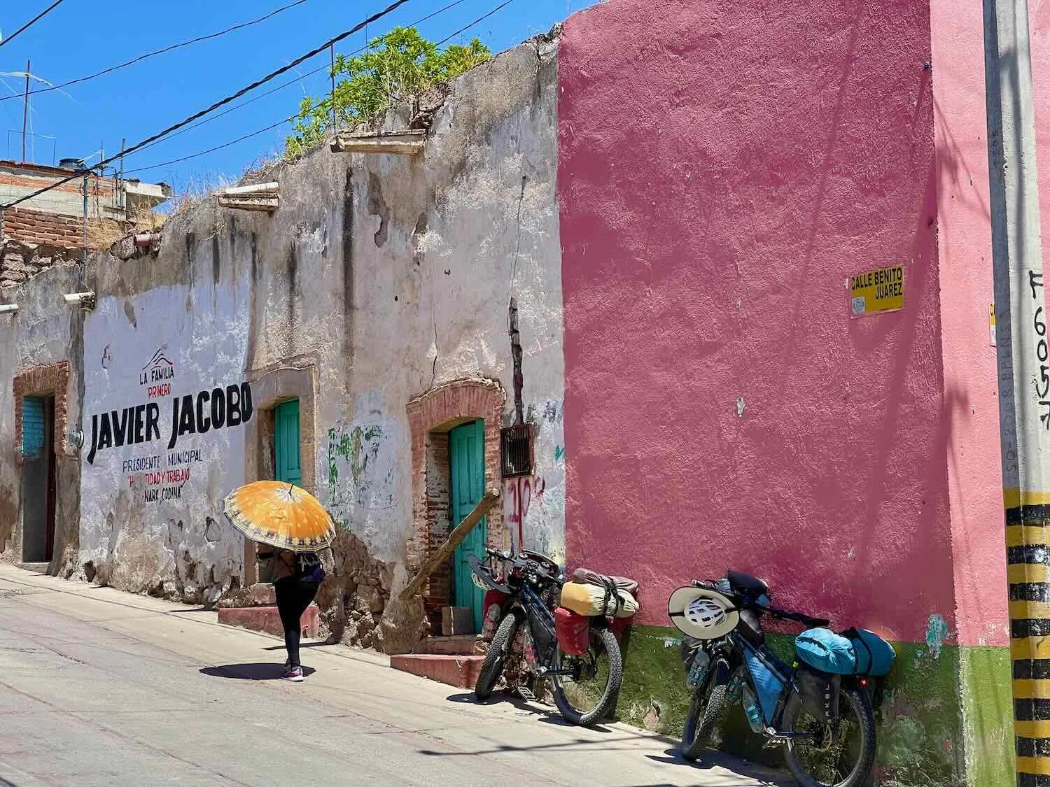 Our bikes, parked on a corner near two small shops where we secured food for another night of camping. Every road in the town was on a steep hill. Genaro Codina, State of Zacatecas, Mexico. Copyright © 2019-2023 Pedals and Puffins.