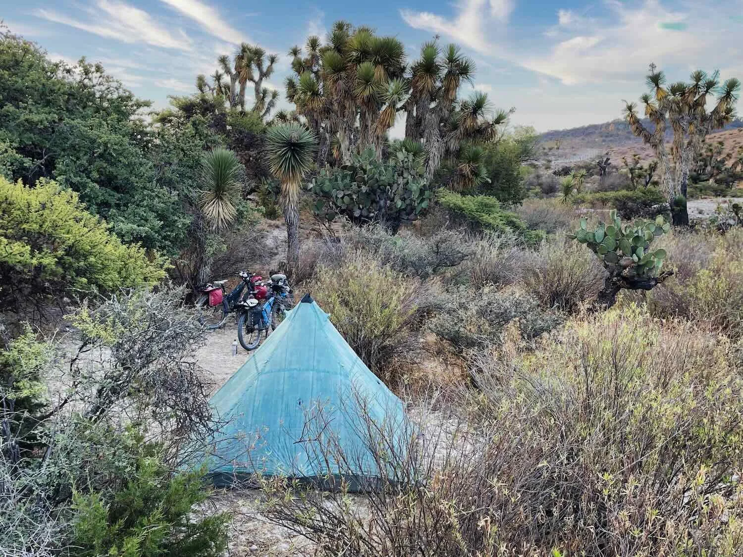 After five hours of cycling across open, treeless hills we found the perfect campsite, nestled among a ribbon of trees within a dry arroyo. South of Genaro Codina, State of Aguascalientes, Mexico. Copyright © 2019-2023 Pedals and Puffins.