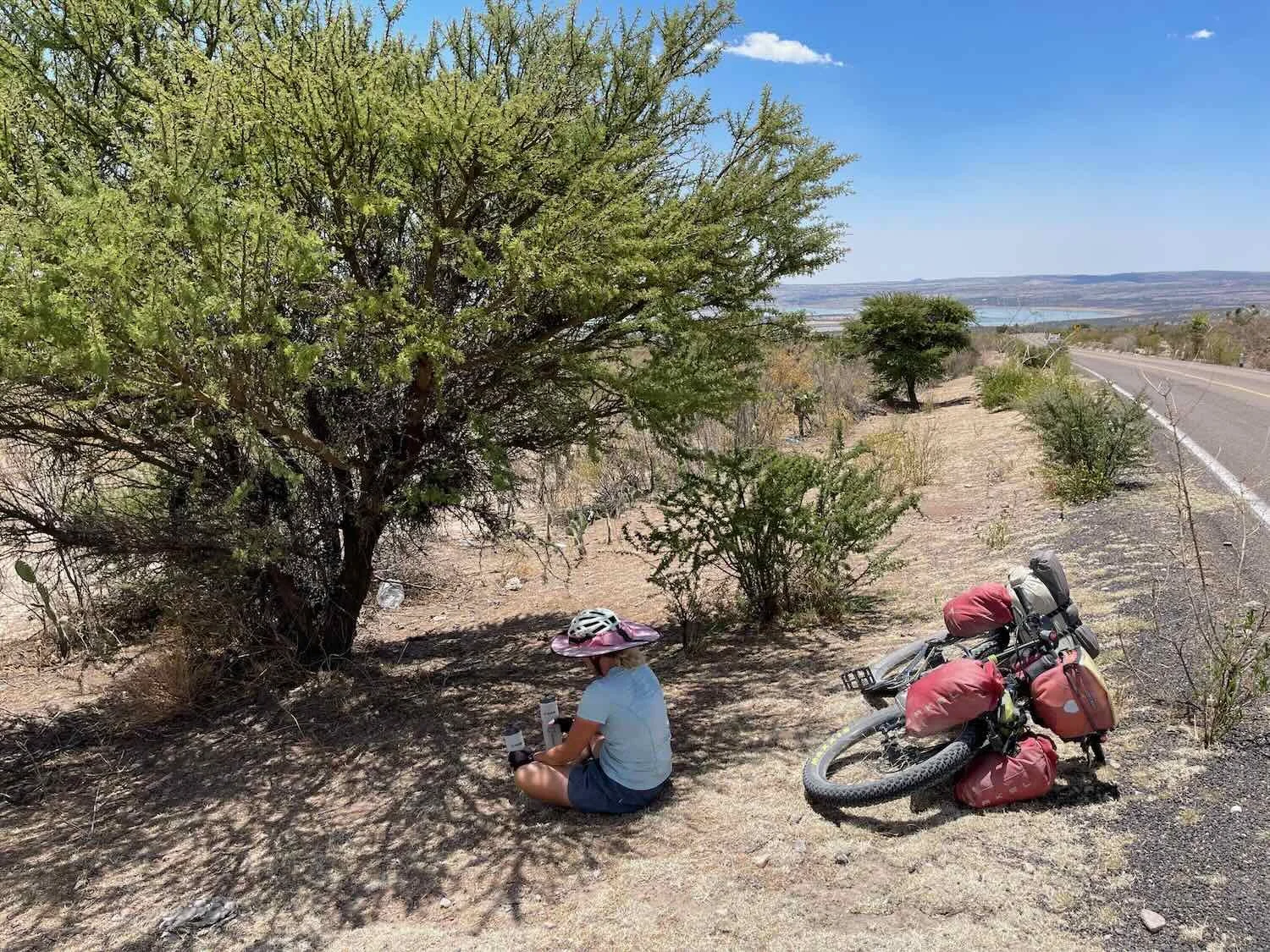 A brief break from climbing uphill in the sun. West of San Antonio de los Ríos, State of Aguascalientes, Mexico. Copyright © 2019-2023 Pedals and Puffins.