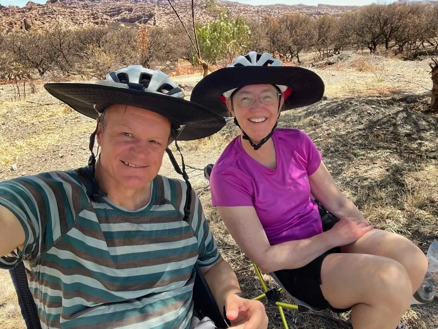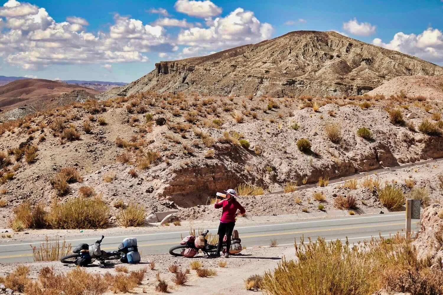 Stopping to re-hydrate among the arid hills of the Cordillera de Chicas. N of Atocha, Potosí Department, Bolivia. Copyright © 2019-2025 Pedals and Puffins.