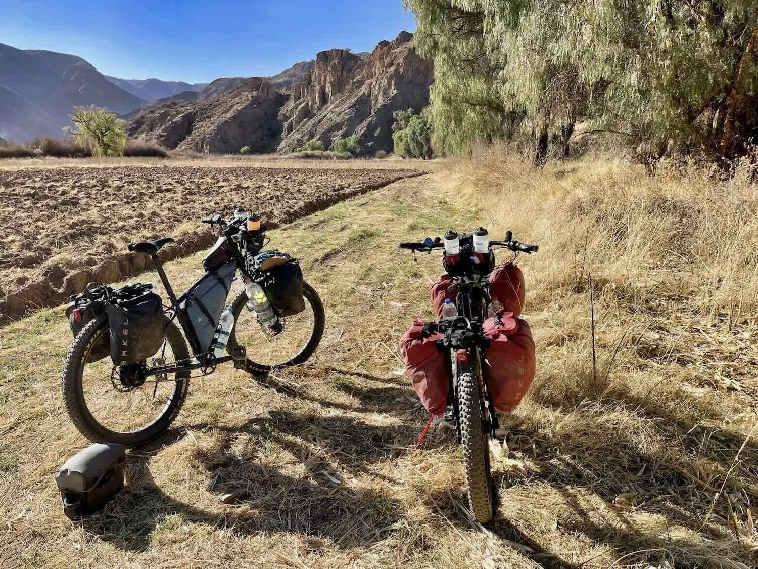 We camped on a dirt road next to a partially-plowed agricultural field, bordered by the canyon walls of the San Juan del Oro River valley. Potosí Department, Bolivia. Copyright © 2019-2025 Pedals and Puffins.