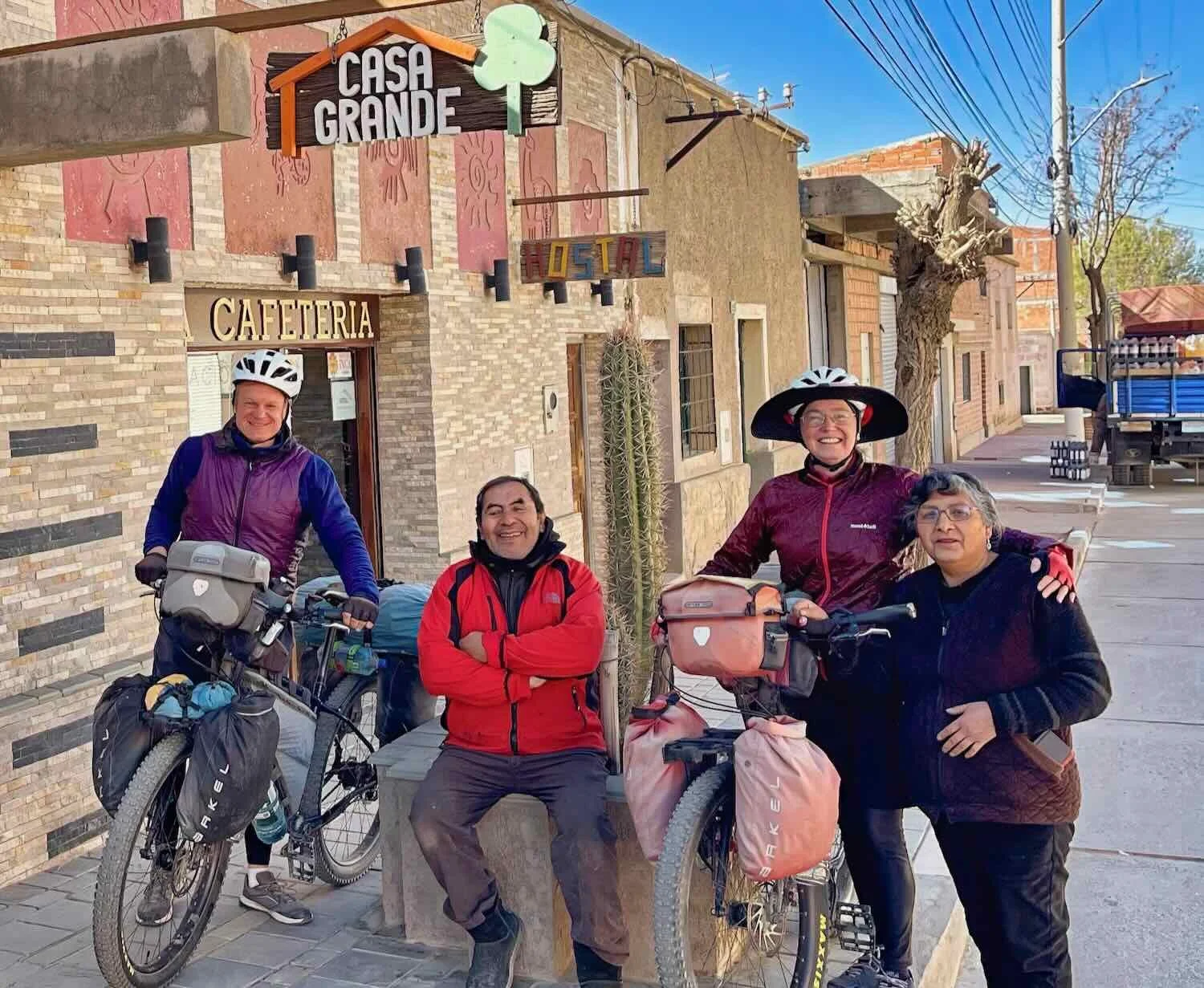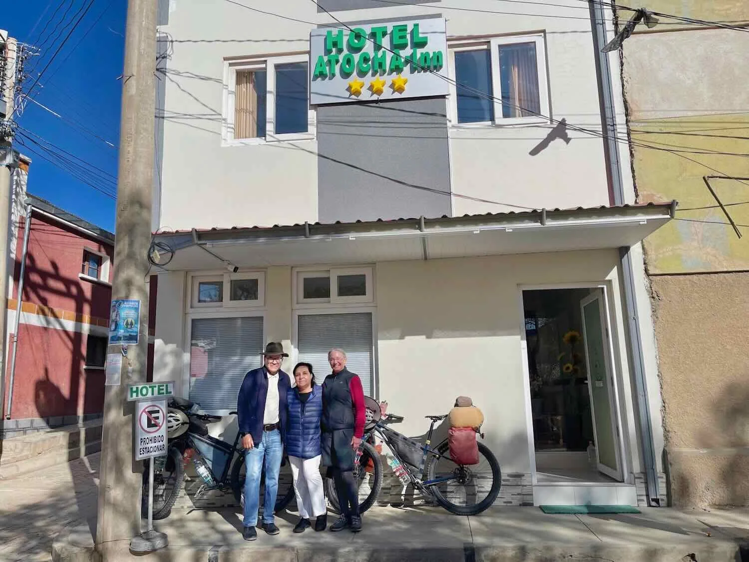 Posing with our hosts, Miguel and Luci, in front of the Hotel Atocha Inn. It was a modern and comfortable hotel, which was a great find in such a remote mining town. Atocha, Cordillera de Chicas, Potosí Department, Bolivia. Copyright © 2019-2025 Pedals and Puffins.