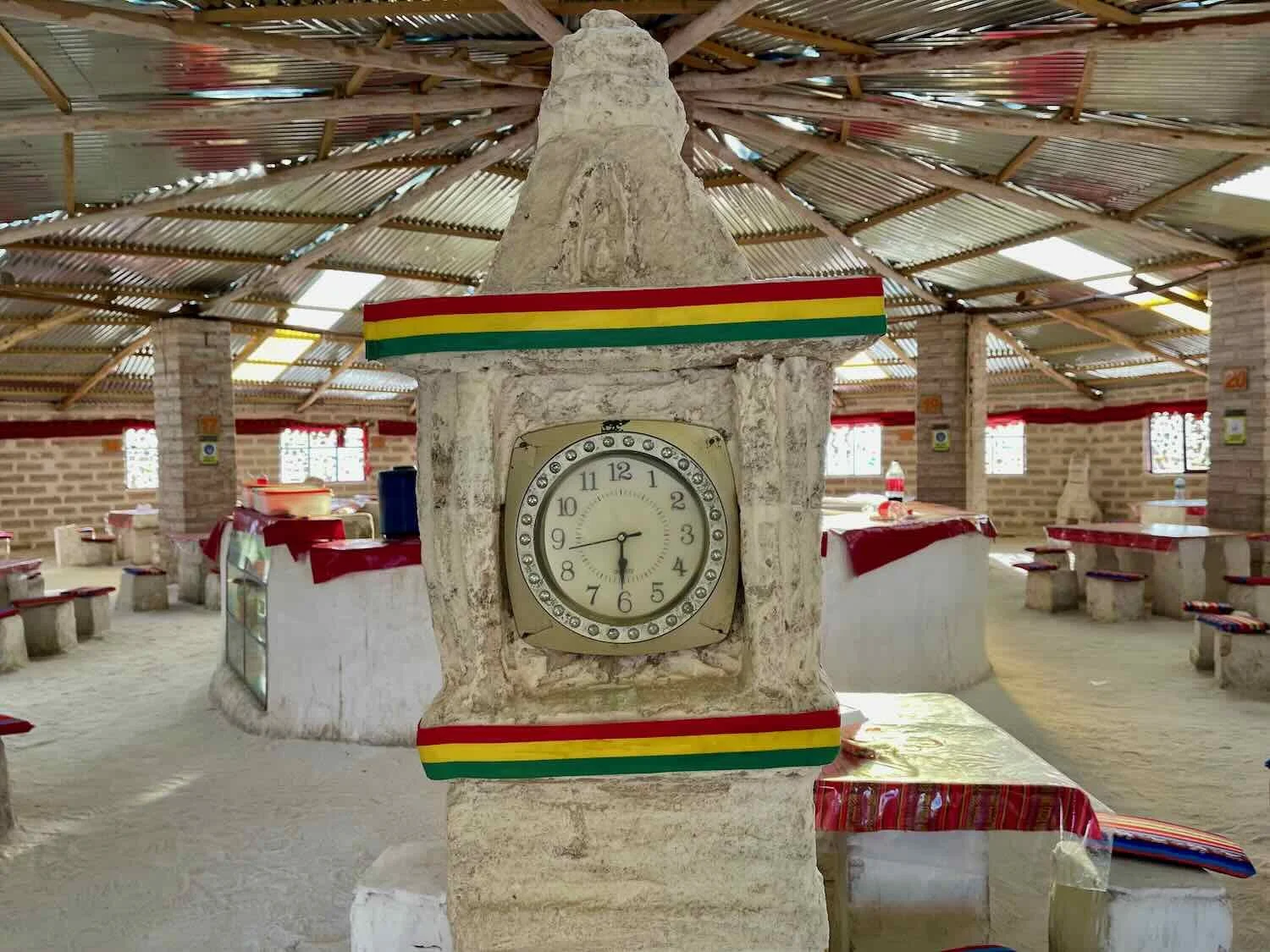 A clock constructed from blocks of salt, inside the common room of the first all-salt hotel in Bolivia (now a museum). Uyuni Salt Flats, Potosí Department, Bolivia. Copyright © 2019-2025 Pedals and Puffins.