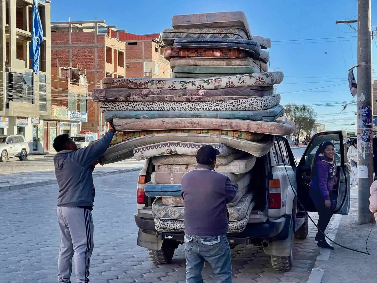 How many mattresses can you load into a vehicle that is not even a truck? This over-sized stack of mattresses seemed emblematic of the town’s critical role as an overnight stop for tourists visiting the salt flats. Uyuni, Potosí Department, Bolivia. Copyright © 2019-2025 Pedals and Puffins.
