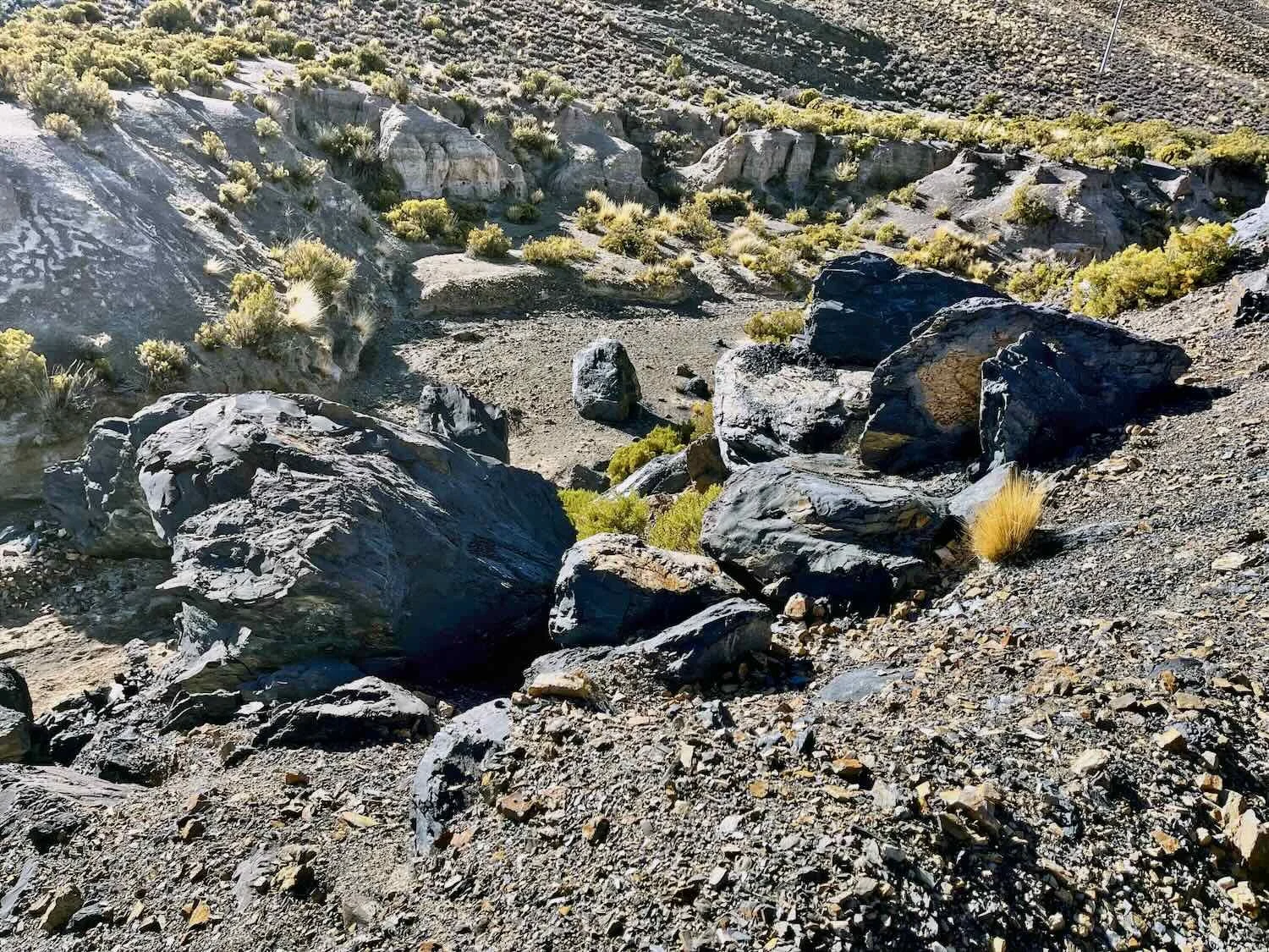 Our campsite for the evening was along the edge of a dry wash that was littered with giant, black boulders that looked like they were made of coal. N of Chaquiciénega, Cordillera de Chicas, Potosí Department, Bolivia. Copyright © 2019-2025 Pedals and Puffins.