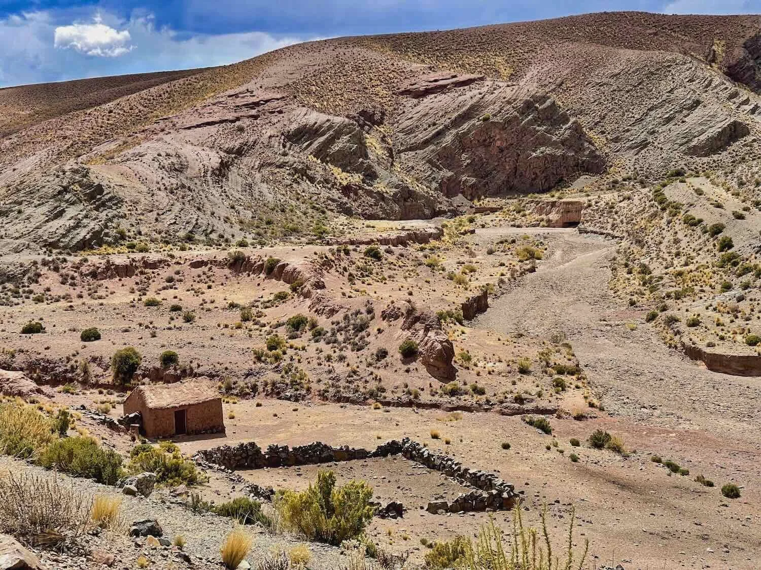 Remote buildings were often clustered close to the foot of the hills. Perhaps it provided wind protection, or access to water sources. We were surprised to see a couple of springs seeping out of the ground near the base of the arid hills. N of San Miguel, Potosí Department, Bolivia. Copyright © 2019-2025 Pedals and Puffins.