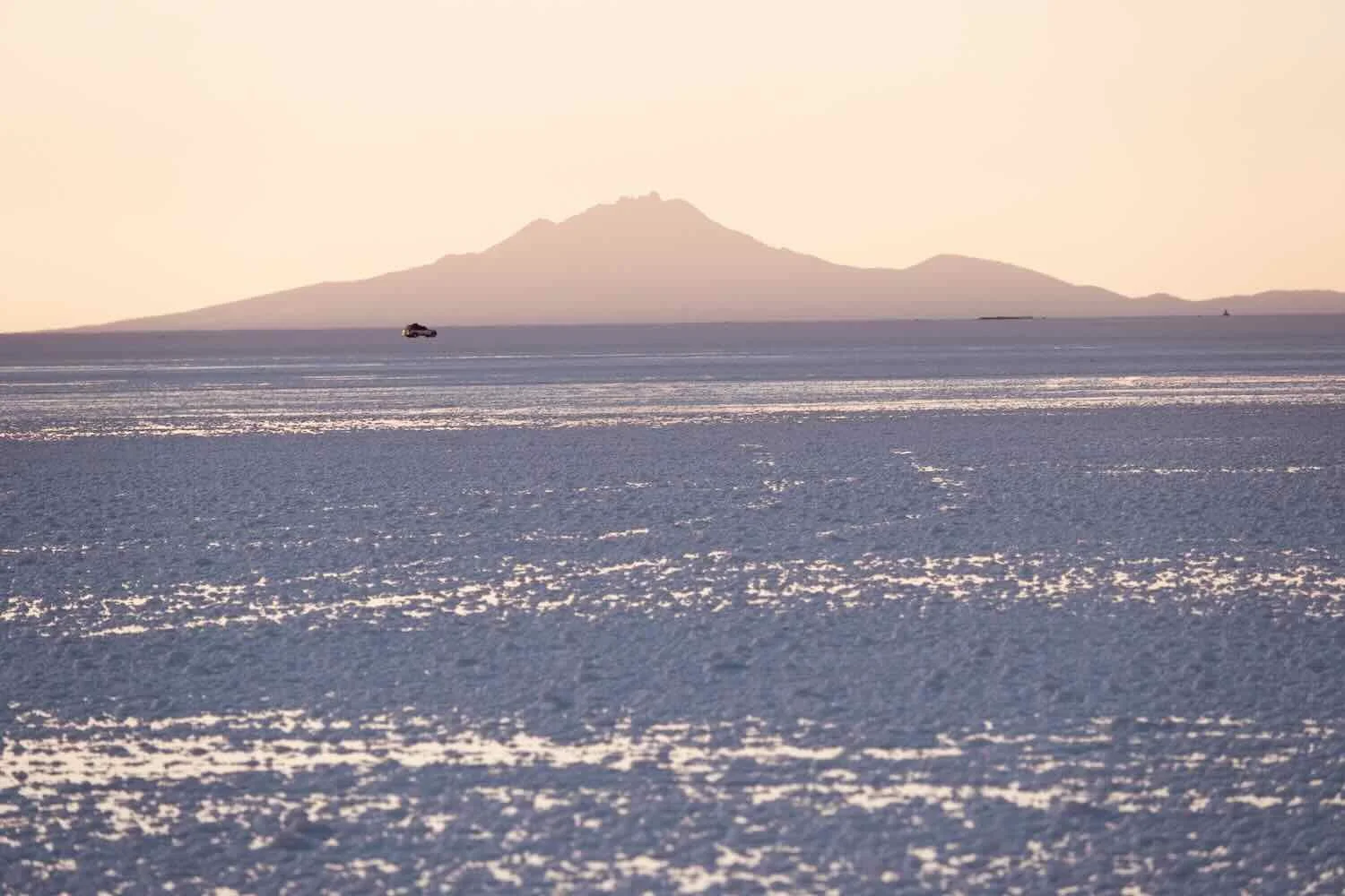 A distant vehicle traversed the salt flats, with the dormant Tunupa Volcano in the background (more than 50 miles away). Uyuni Salt Flats, Potosí Department, Bolivia. Copyright © 2019-2025 Pedals and Puffins.