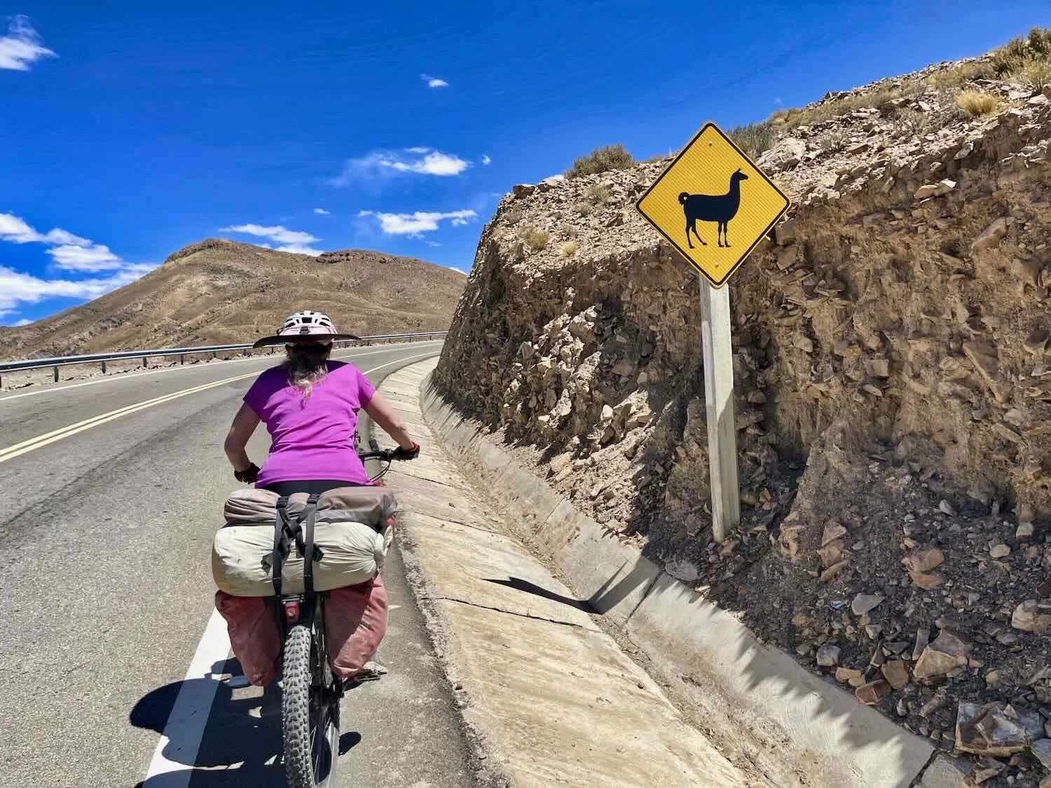 A roadside sign was a reminder that llamas are well adapted to high-altitude living. Compared to most other animals, llamas have red blood cells that capture oxygen more efficiently at low air pressures, and they have a larger lung capacity for their body size. Near Chaquiciénega, Cordillera de Chicas, Potosí Department, Bolivia. Copyright © 2019-2025 Pedals and Puffins.