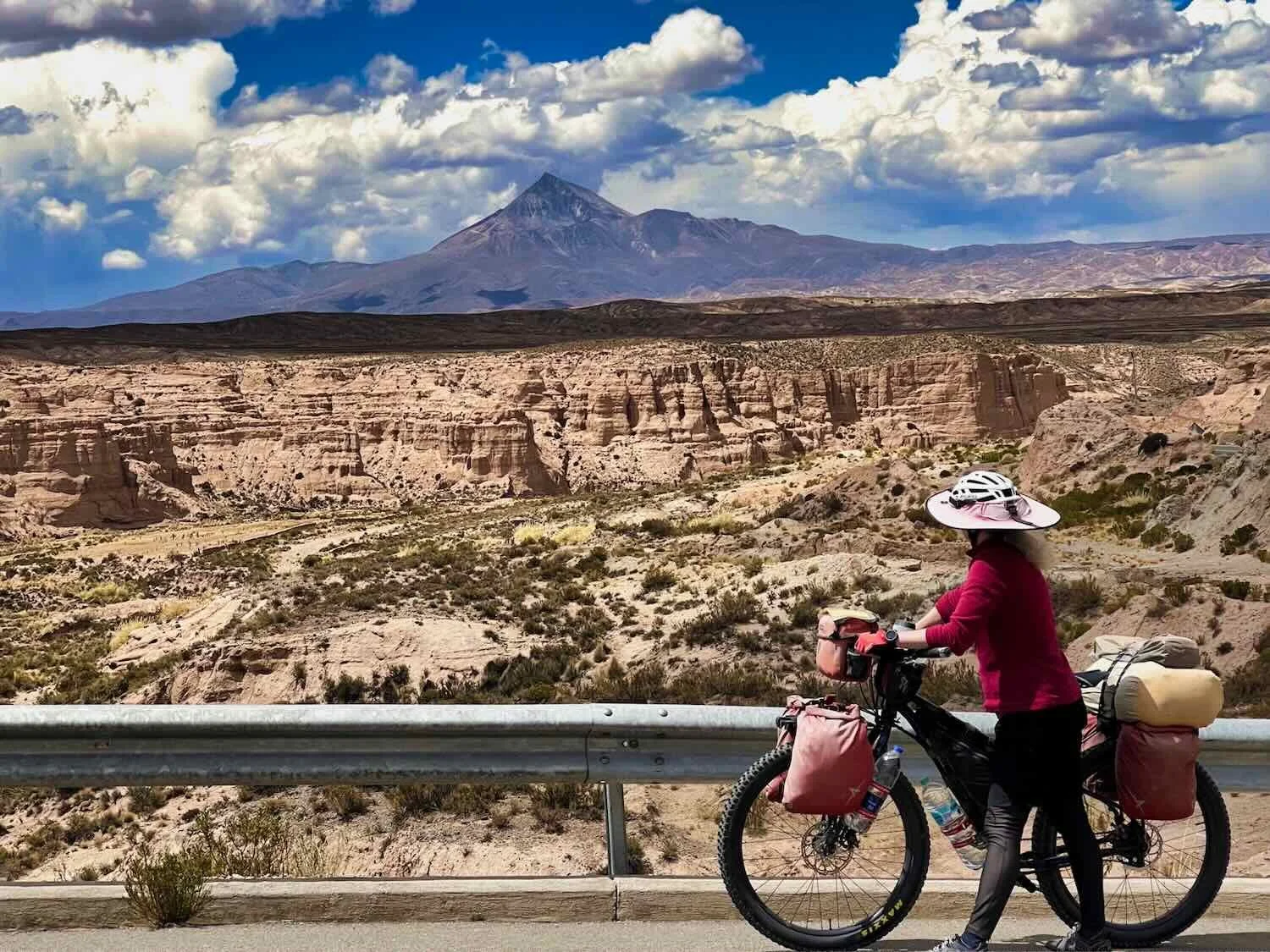 View of the canyonlands from the top of the pass, with the Cerro Chorolque peak in the distance. N of Atocha, Potosí Department, Bolivia. Copyright © 2019-2025 Pedals and Puffins.