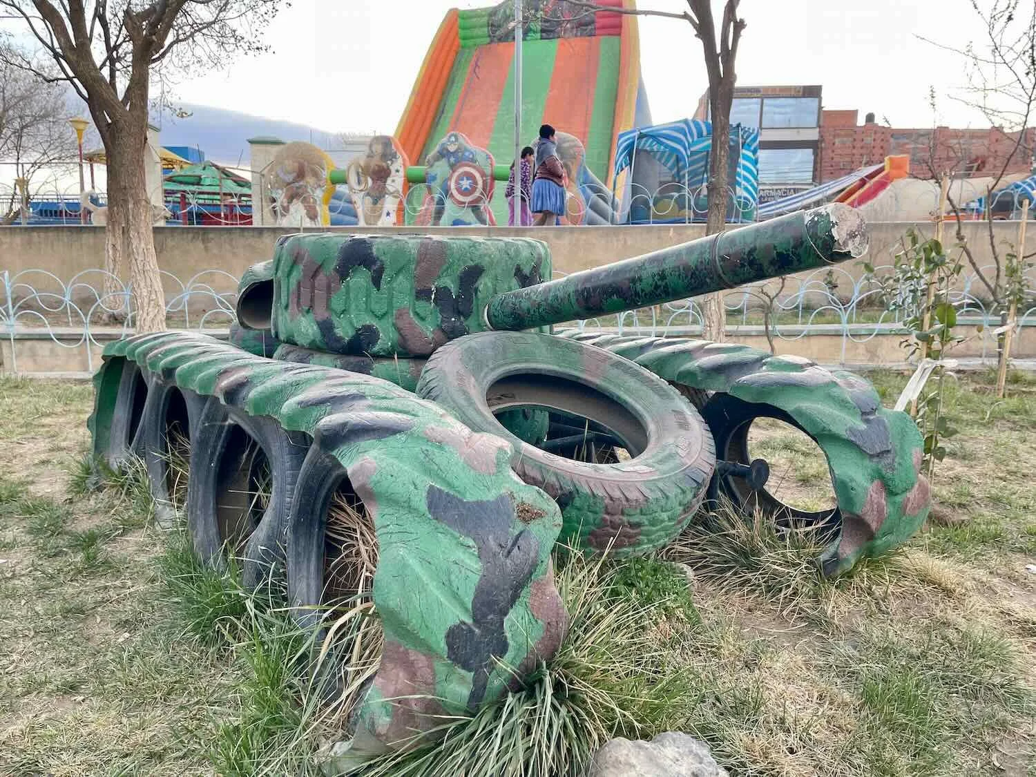 Near one side of the outdoor market sat a whimsical tank statue, constructed almost entirely from old tires. Villazón, Potosí Department, Bolivia. Copyright © 2019-2025 Pedals and Puffins.