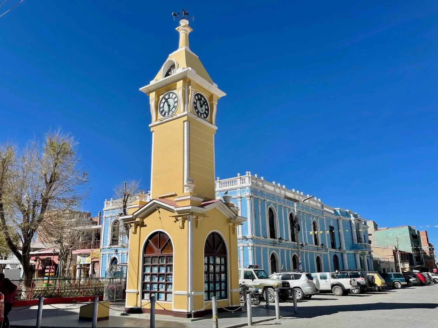 A German-style clock tower dating to the town’s railroad era sat at one end of Arce Avenue, in the pedestrian-only tourist district. Uyuni, Potosí Department, Bolivia. Copyright © 2019-2025 Pedals and Puffins.