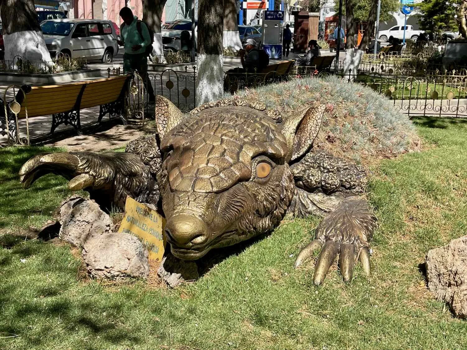 A giant, brass armadillo seemed to be emerging from its burrow on one side of the central plaza. City of Oruro, Bolivia. Copyright © 2019-2025 Pedals and Puffins.