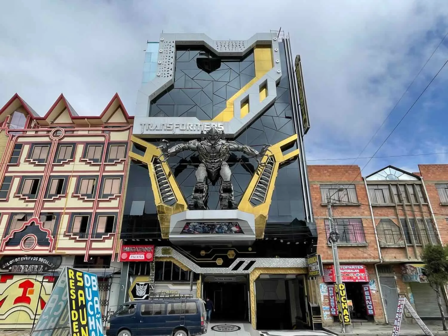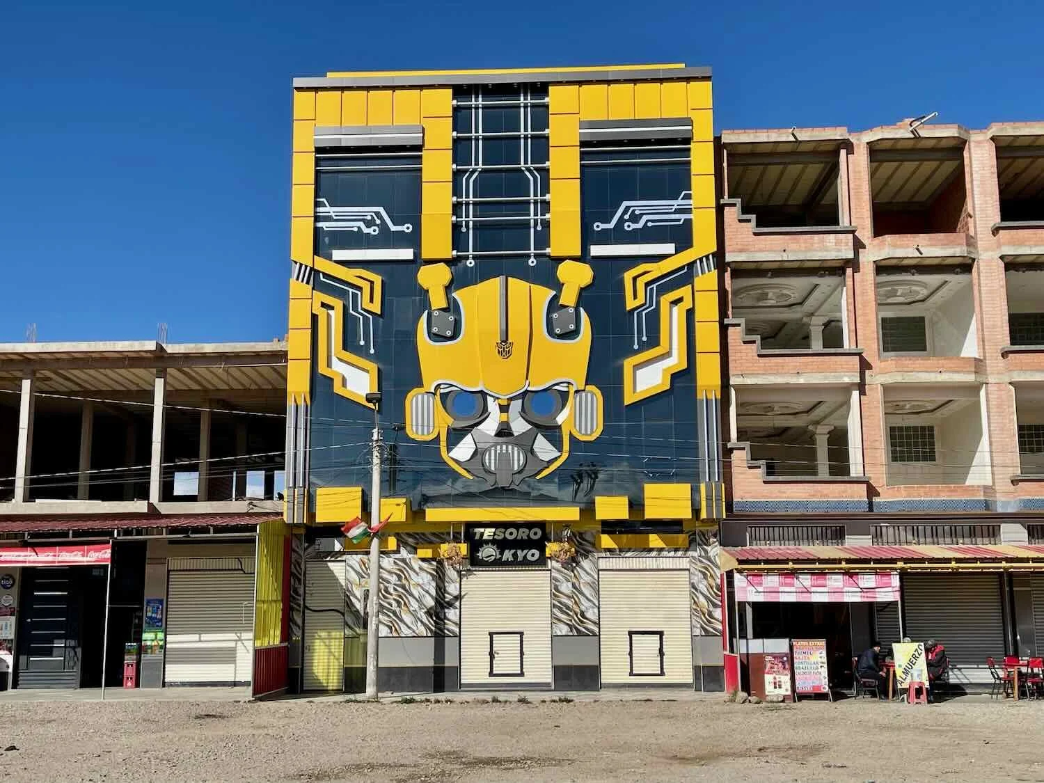 As we got closer to La Paz, we saw even more of the eclectic, cholet-style buildings with their bold colors and Transformer-themed designs. This building even had a replica of one of the Autobots mounted on the front. El Alto, La Paz Department, Bolivia. Copyright © 2019-2025 Pedals and Puffins.
