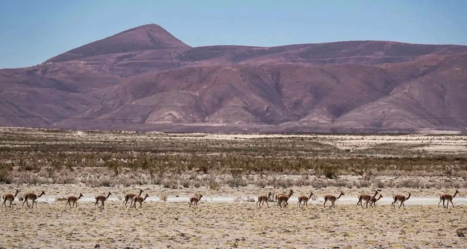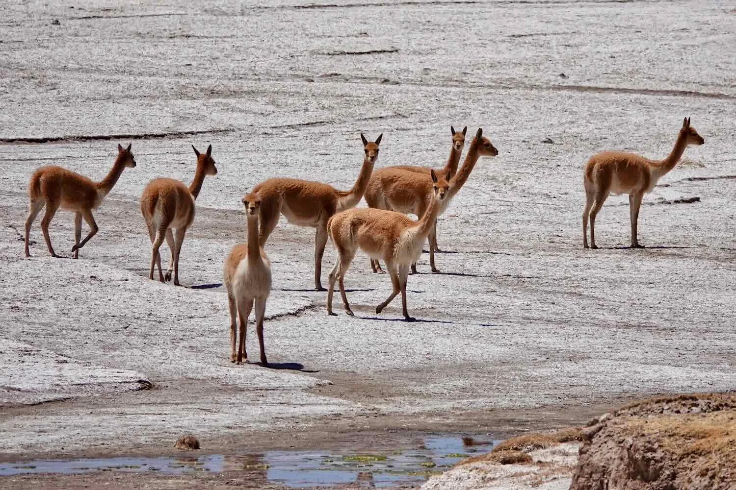 A large herd of wild vicuñas (the wild relatives of alpacas) made its way across the salty mud flats north of Uyuni, Potosí Department, Bolivia. Copyright © 2019-2025 Pedals and Puffins.
