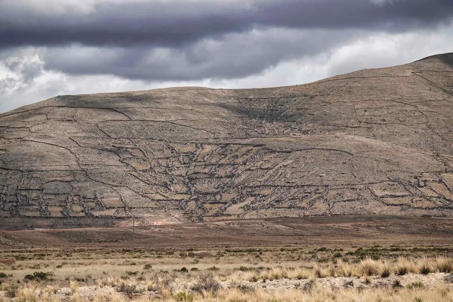 As we got closer to El Alto, there were a couple of places where we saw extensive networks of stone walls that divided the hillsides into dozens of small plots. The practice of using stone walls to organize family and community lands dates back to pre-Columbian times. Near Ayo Ayo, La Paz Department, Bolivia. Copyright © 2019-2025 Pedals and Puffins.