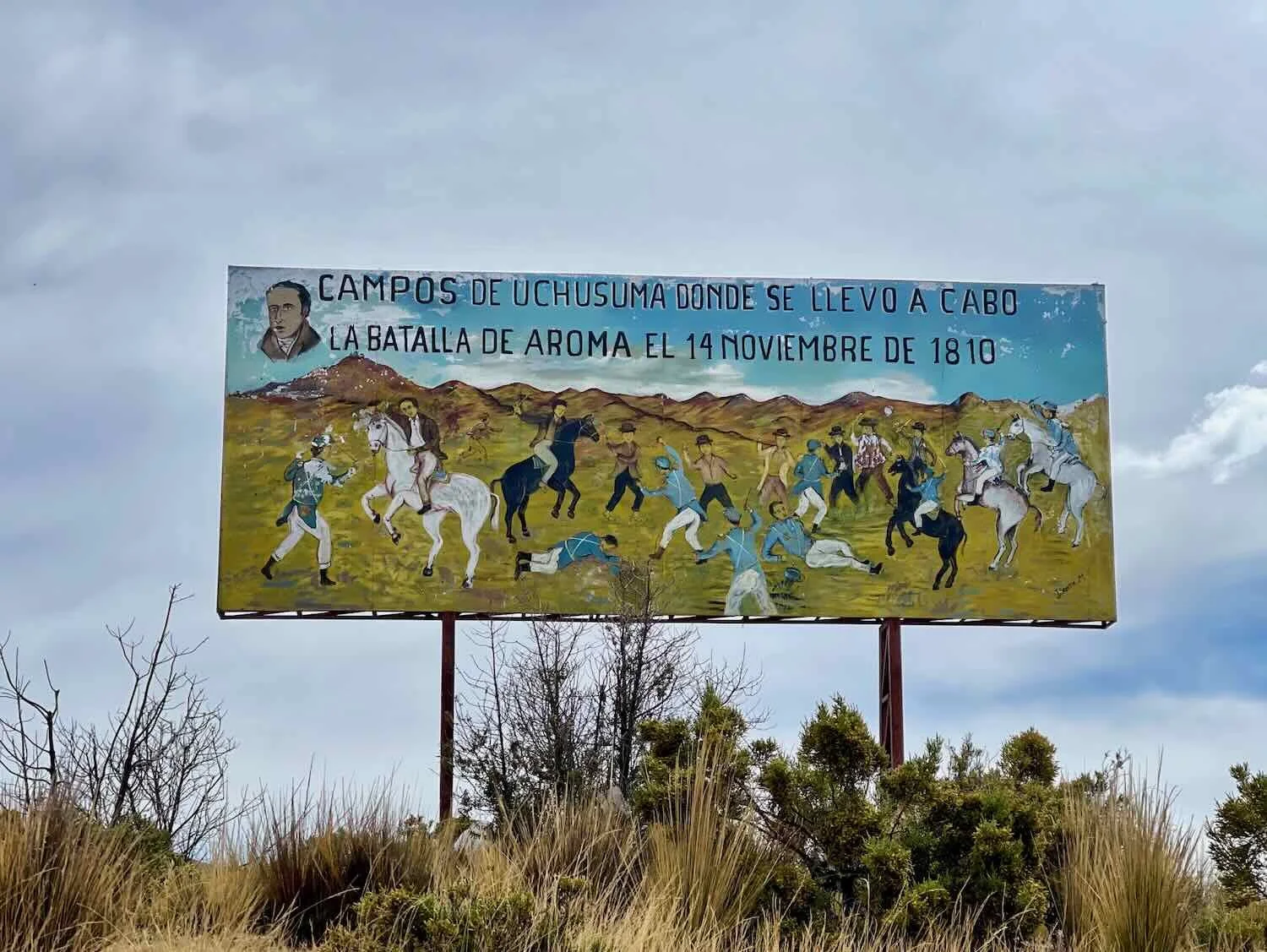 A sign along the highway commemorated the site of the Battle of Aroma (1810), one of the earliest victories in Bolivia’s war of independence - and considered the birth of the country’s new army. Near Sica Sica, La Paz Department, Bolivia. Copyright © 2019-2025 Pedals and Puffins.