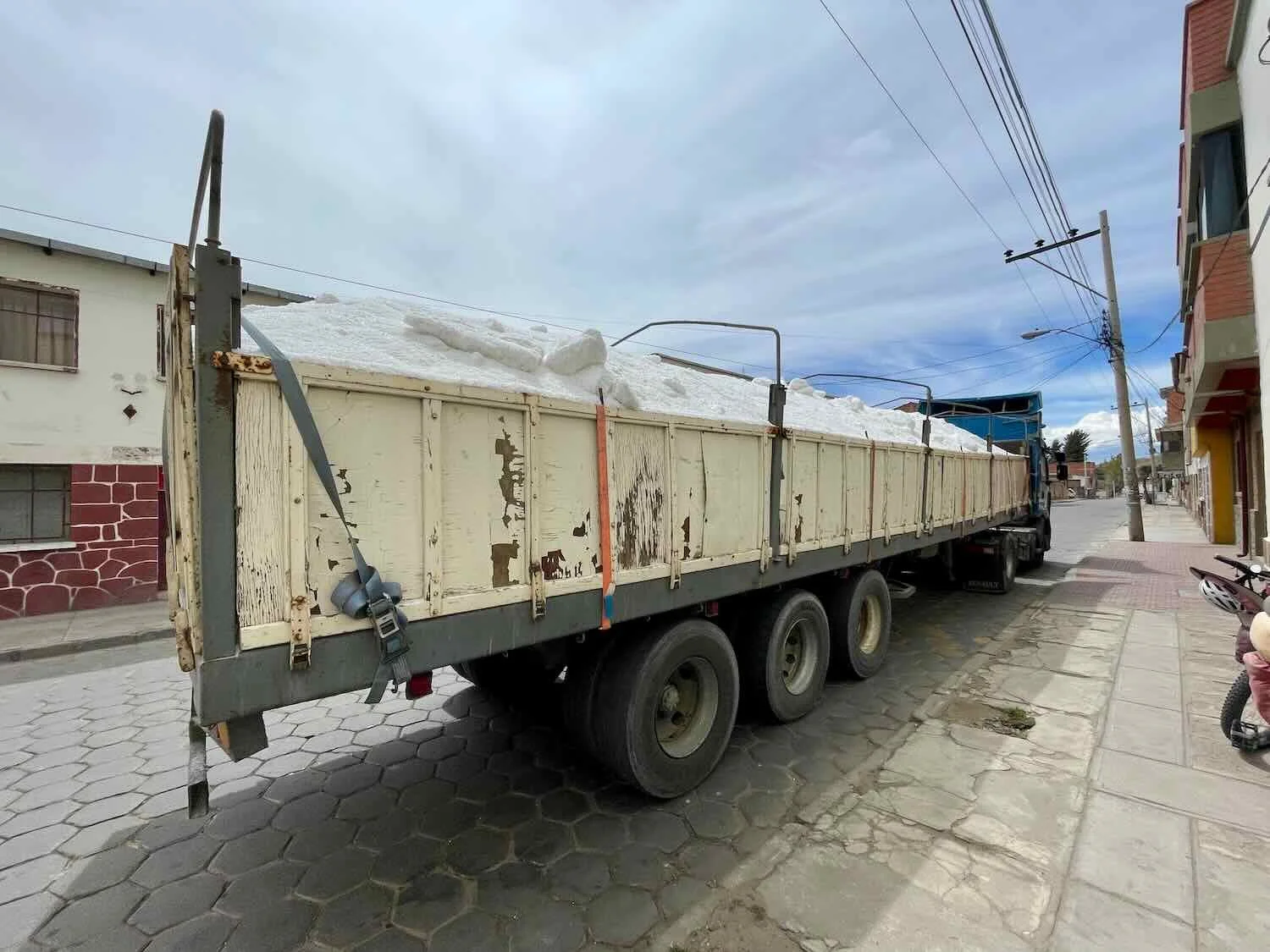 Ever since we had left the town of Colchani - a major producer of salt in Bolivia - we had occasionally been passed on the highway by cargo trucks overflowing with salt. Often the side of the highway was dusted with chunks of salt that fell from the trucks. In Santiago de Huari, we got a close-up look at one of the salt trucks parked near the plaza. Santiago de Huari, Oruro Department, Bolivia. Copyright © 2019-2025 Pedals and Puffins.