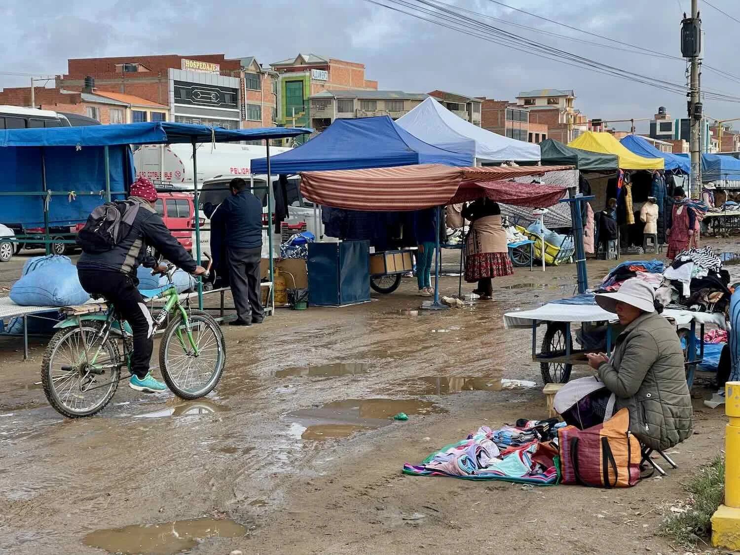 Unfortunately, it wasn’t long before the bicycle path ran smack into a local market, where many of the vendors had set up their stalls right in the path (presumably to avoid the mud). That sent us, and some other local cyclists, back onto the mud. El Alto, La Paz Department, Bolivia. Copyright © 2019-2025 Pedals and Puffins.