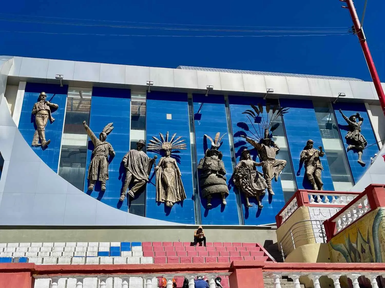 A cable car system was built to take tourists from the city center up onto the hill of the Virgin of Socavón. The exterior of the cable car station was decorated with larger than life figures drawn from Oruro’s large cast of Carnaval characters. City of Oruro, Bolivia. Copyright © 2019-2025 Pedals and Puffins.