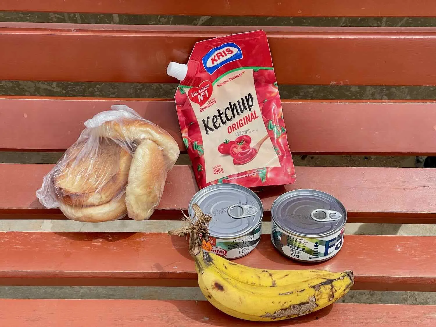 A look at our typical, “on-the-go” lunch of easy to source bread, tuna and bananas. Sica Sica, La Paz Department, Bolivia. Copyright © 2019-2025 Pedals and Puffins.