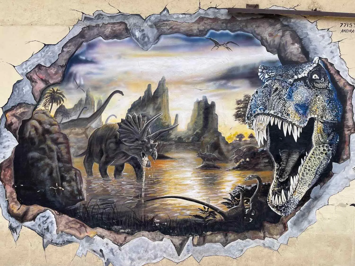 This mural offered a glimpse into a prehistoric world on the far side of the wall. City of Oruro, Bolivia. Copyright © 2019-2025 Pedals and Puffins.