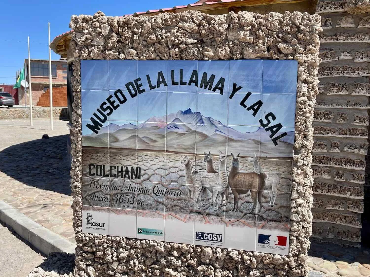 The sign outside the Museum of Llamas and Salt fit the theme, with a depiction of some llamas standing on the salt flats. Colchani, Potosí Department, Bolivia. Copyright © 2019-2025 Pedals and Puffins.