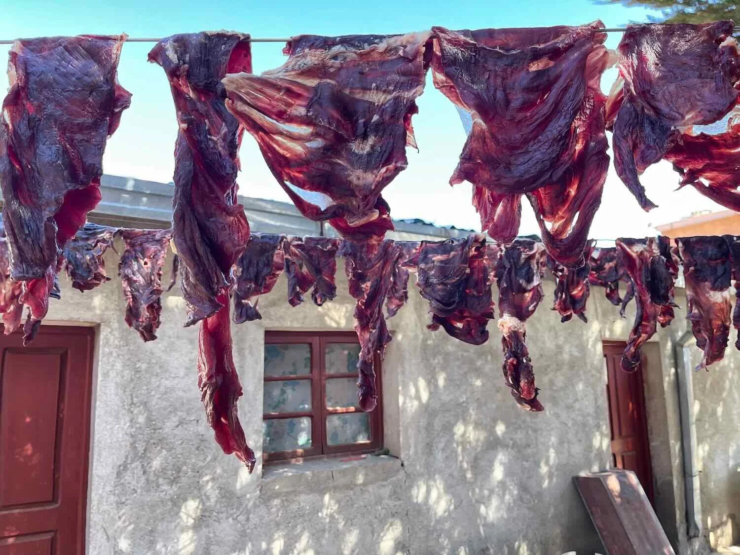 The hospedaje in Pazña had a lot of interesting quirks. One of the first things that really stood out was the presence of multiple lines hung throughout the inner courtyard. But instead of holding drying laundry, the lines were crammed with super-thin slices of air-drying meat. The pieces were hanging so low that we had to duck under them each time we entered or exited the hospedaje, to avoid hitting our heads on the meat. Refrigeration is often missing in many homes, so drying meat for preservation is still important here. Pazña, Oruro Department, Bolivia. Copyright © 2019-2025 Pedals and Puffins.