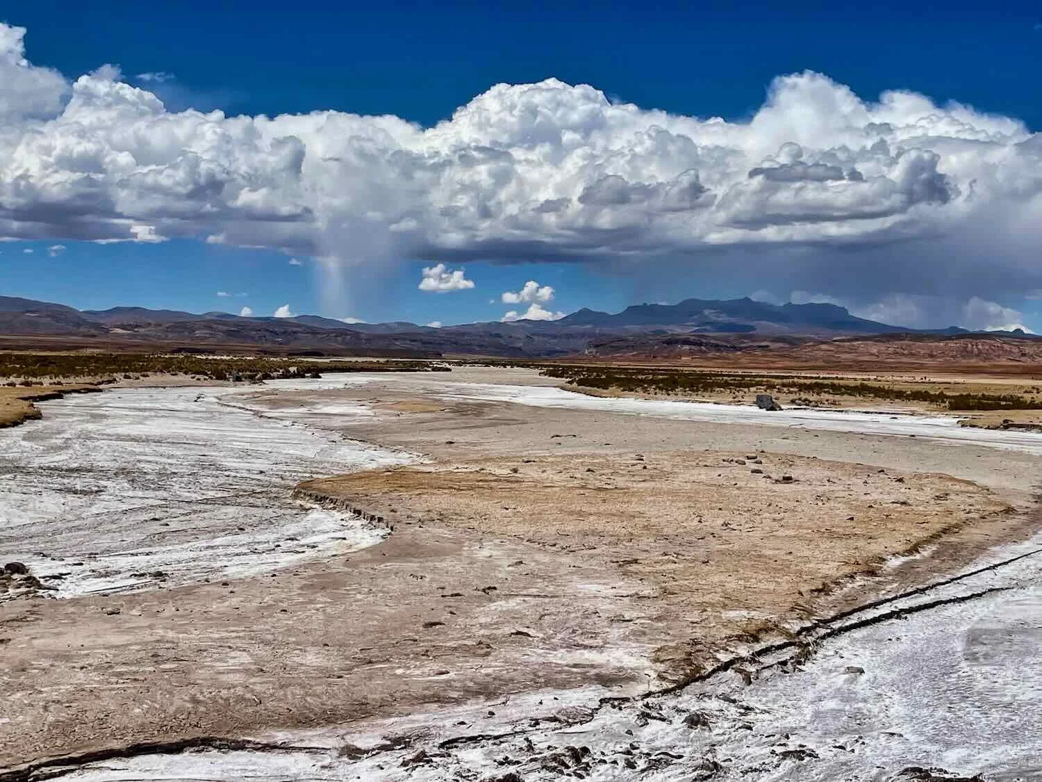 Our first two days of cycling out of Uyuni, Bolivia, took us across broad, flat plains surrounding the famous Uyuni Salt Flats. There was not quite as much salt along the highway as there was out on the salt flats, but the mud flats were still dusted with a thin crust of white salt.