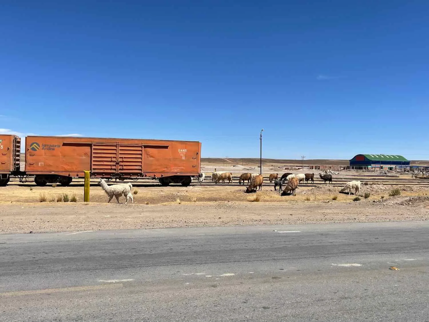 On the outskirts of Río Mulato, a herd of llamas grazed along a set of railroad tracks. Río Mulato, Potosí Department, Bolivia. Copyright © 2019-2025 Pedals and Puffins.