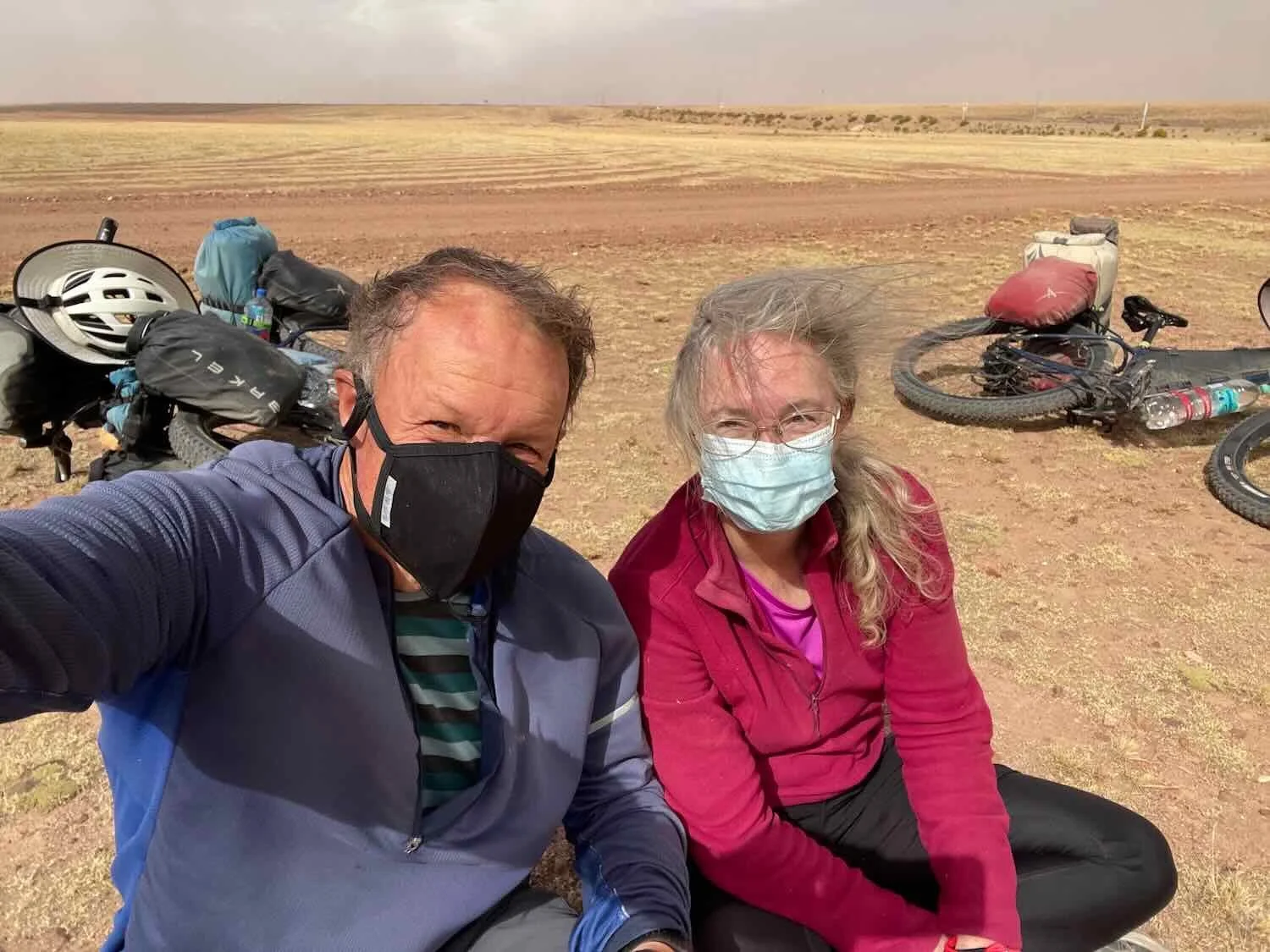 When we were unable to out-run a fast moving wall of sand, we donned face masks, laid down our bikes, and waited. There was nowhere to take shelter in the area, not even a bush to hide behind, so we just sat on the ground. This photo was taken after the worst of the storm had already passed. S of Huacoma, Potosí Department, Bolivia. Copyright © 2019-2025 Pedals and Puffins.