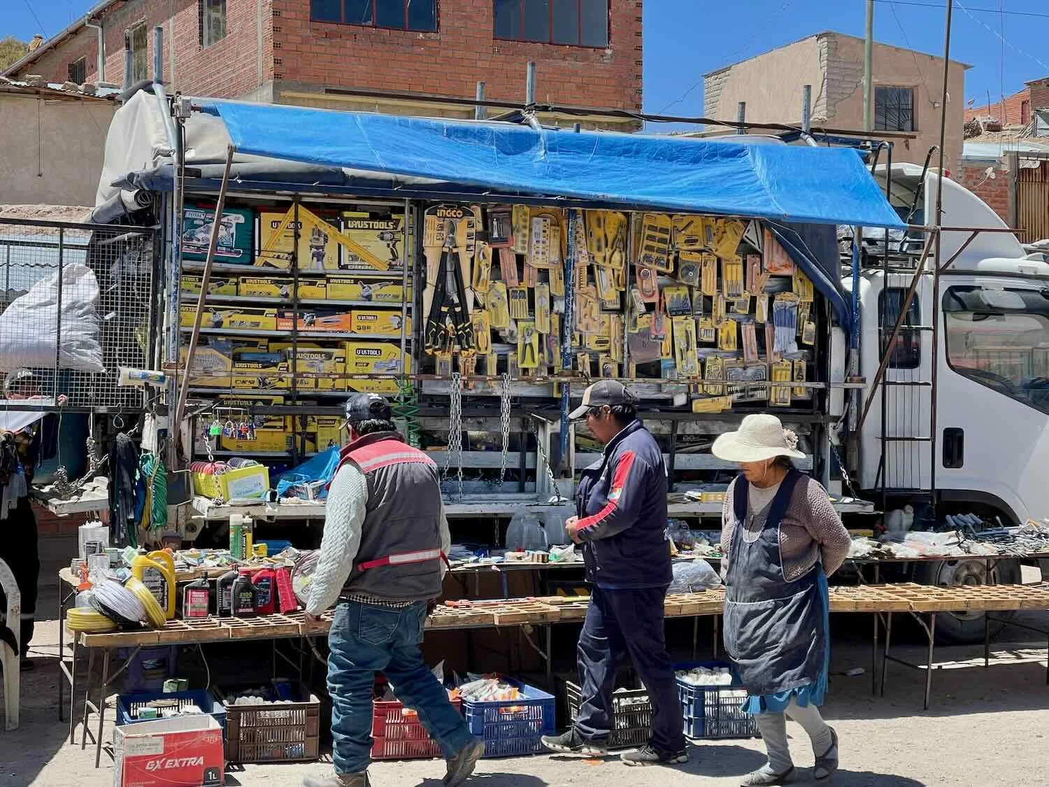 With quinoa trading driving local commerce, the rest of the market has also become a hive of commercial activity. Instead of being laid out neatly along the city streets, the whole market was crammed into a large, dirt plaza at the edge of town. Most of the plaza had become a parking lot, as it appeared that everyone from the surrounding countryside had driven to town for the market. Cars streamed in from side streets, parking side to side, and bumper to bumper, covering a whole city block. Market stalls selling all manner of clothes, home goods, hardware and street food formed a wreath of shops for several blocks surrounding the plaza. It was one of the most crowded and chaotic markets we had seen during our travels.