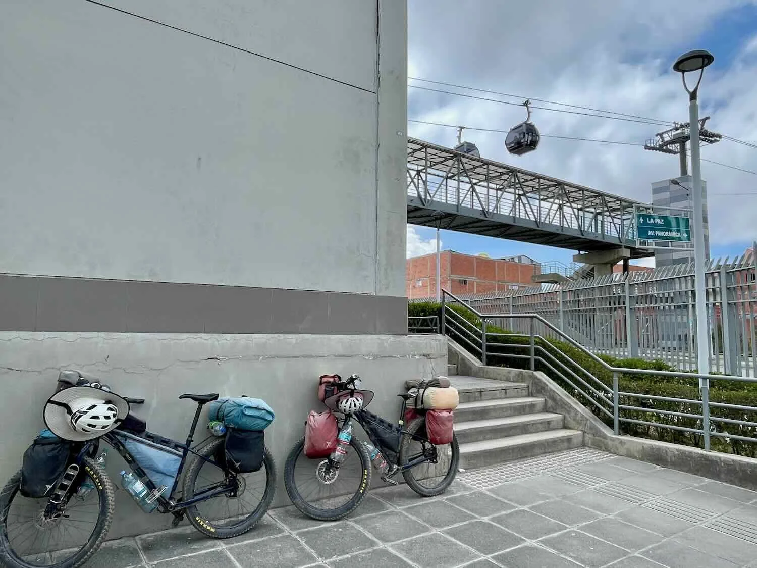 Our bikes parked outside the Purple Line cable car station in El Alto, La Paz Department, Bolivia. Copyright © 2019-2025 Pedals and Puffins.