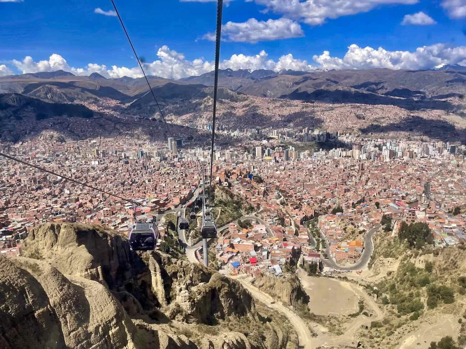 Descending back into La Paz via the Teleférico, after spending an afternoon at the El Alto weekly market. El Alto, La Paz Department, Bolivia. Copyright © 2019-2025 Pedals and Puffins.
