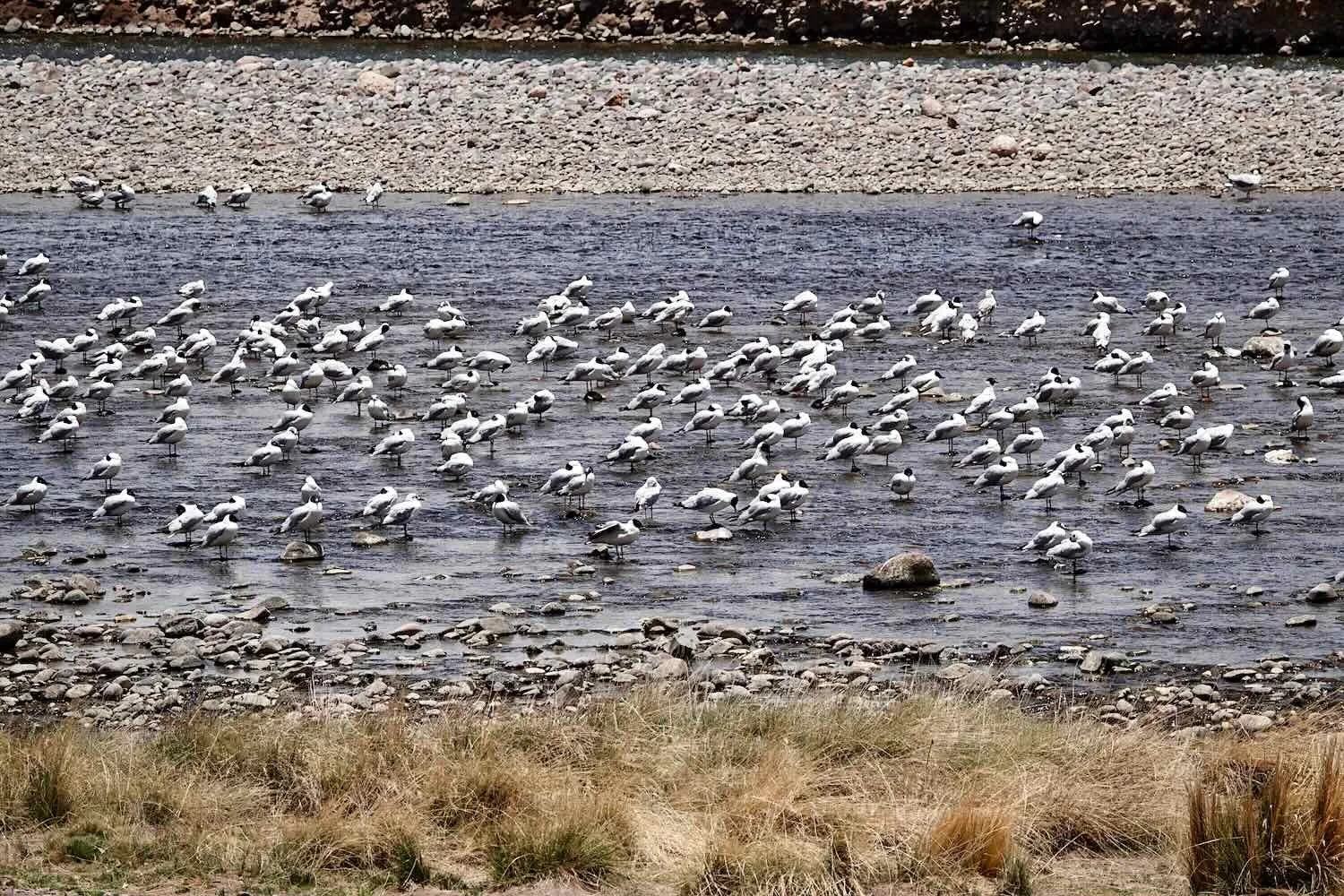 Large flocks of Andean Gulls rested in the shallows of the Cabanillas River, E of Santa Lucía, Puno Department, Peru. Copyright © 2019-2026 Pedals and Puffins.
