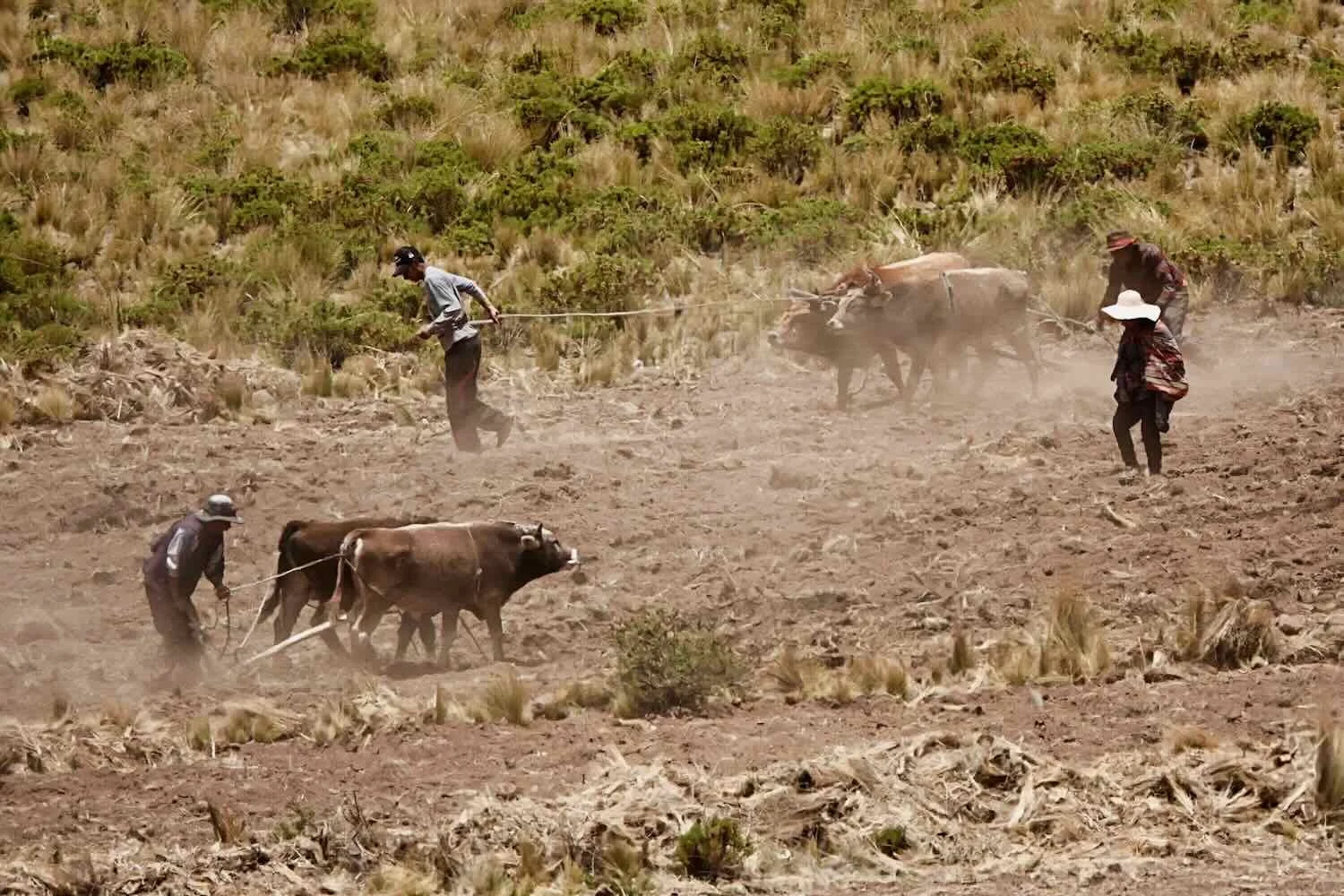 Outside of Puno, we cycled past lots of small, tilled fields. Some families were out plowing the fields with teams of oxen, or sometimes by hand. Tending the fields has long been a community event in Andean culture. After plowing, the dirt was exposed to the persistent winds - often forming dust devils that rose hundreds of feet into the air. E of Tiquillaca, Puno Department, Peru. Copyright © 2019-2026 Pedals and Puffins.