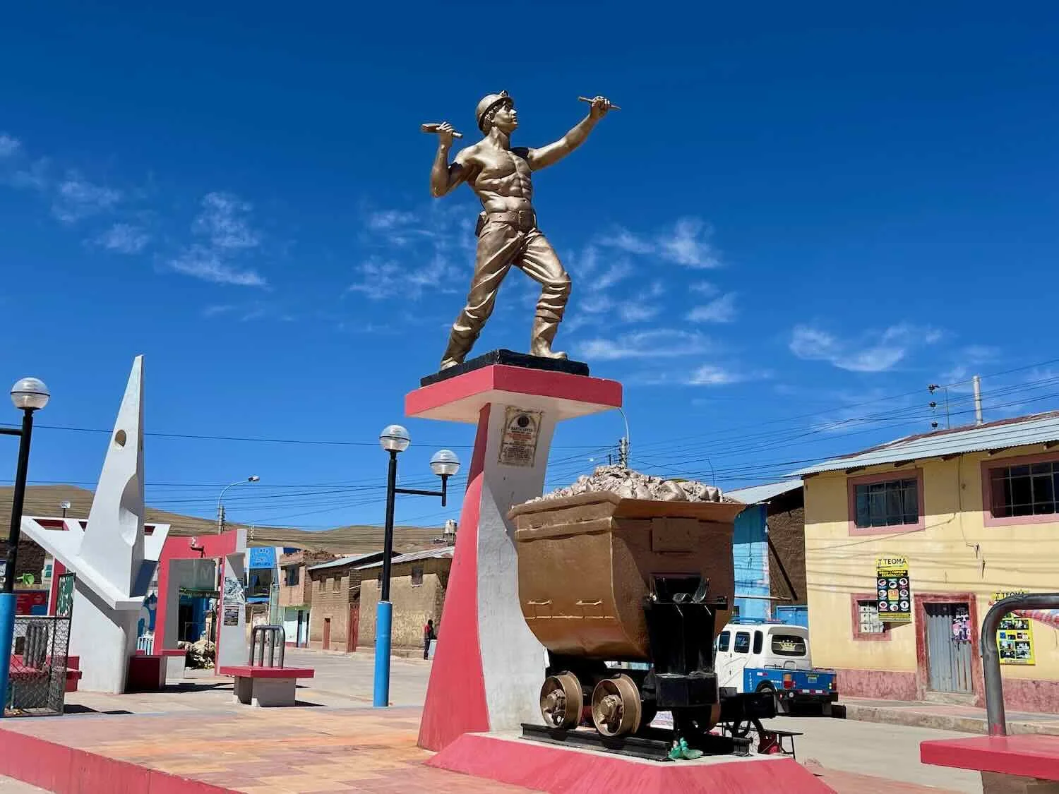 The Miner’s Monument rose over one of the main road intersections in town. Santa Lucía, Puno Department, Peru. Copyright © 2019-2026 Pedals and Puffins.