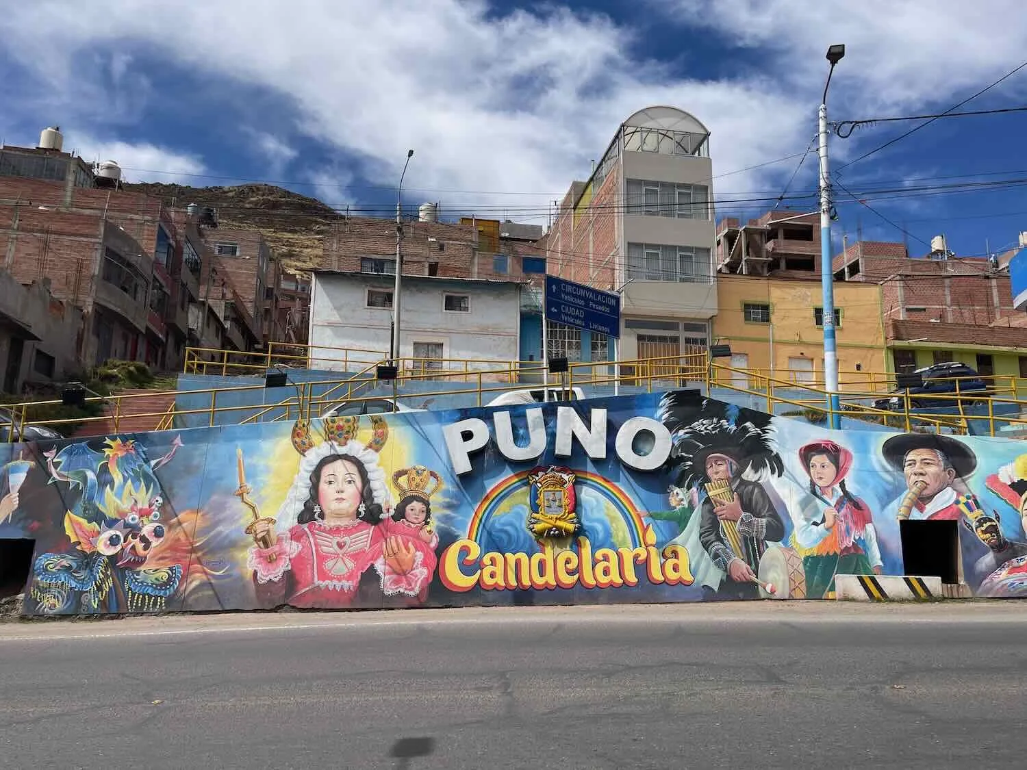A roadside mural honored Puno’s famous Virgin of Candelaria Festival. As with other celebrations on the altiplano, the festival dates back hundreds of years and combines Catholic symbolism with indigenous, Andean traditions. City of Puno, Peru. Copyright © 2019-2026 Pedals and Puffins.
