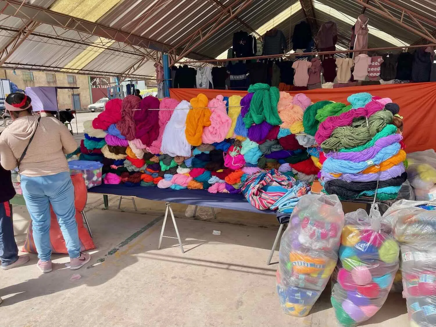 Given the town’s focus on alpaca wool production, we wondered if this pile of yarn for sale in the municipal market was alpaca. But it probably was not. The colors were too bright. Alpaca wool is usually colored using natural dyes that have more earthy hues. Santa Lucía, Puno Department, Peru. Copyright © 2019-2026 Pedals and Puffins.