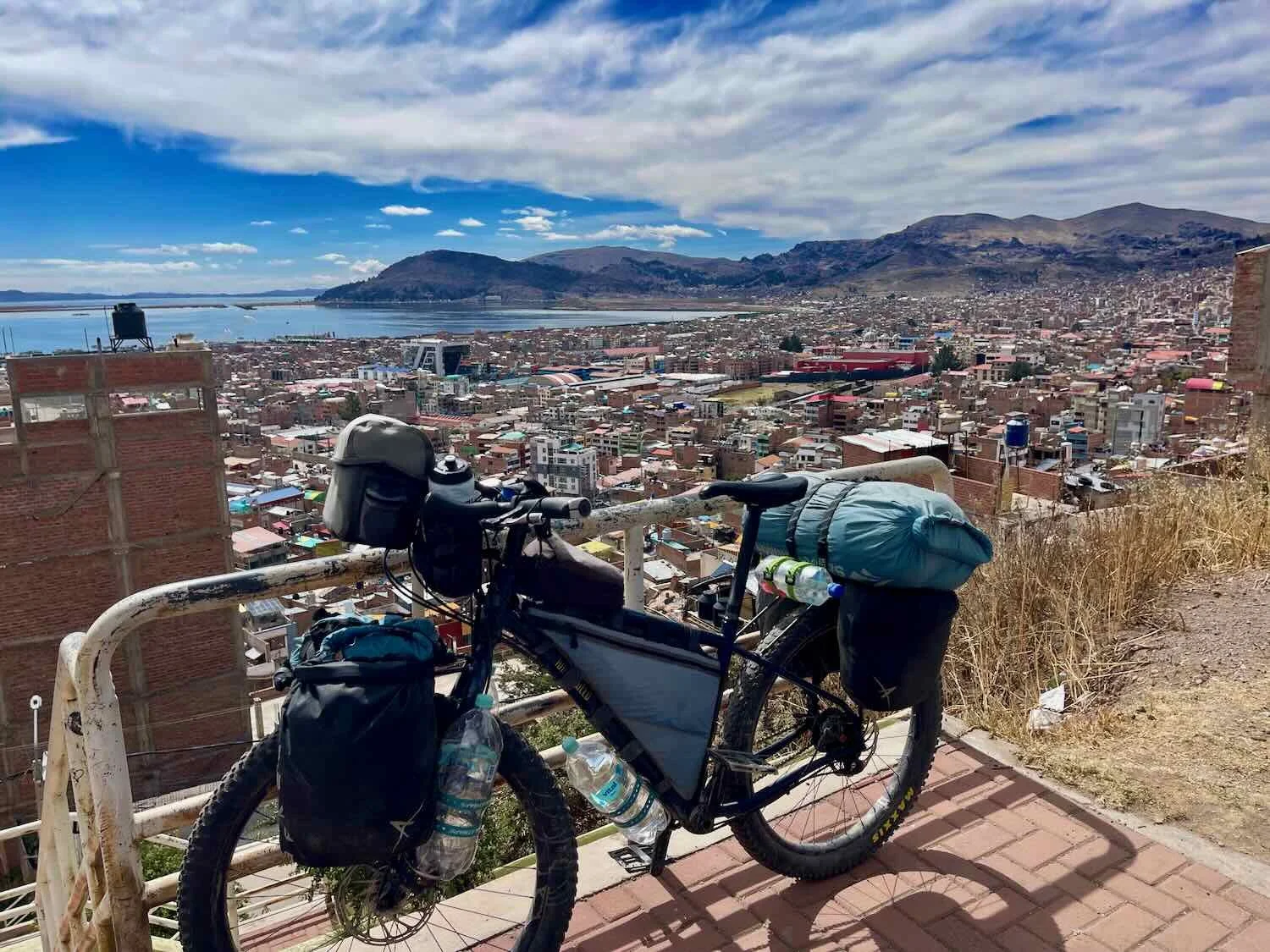 Some routes through the city were too steep to even make a road, resulting in long flights of stairs to reach neighborhoods high on the hillside. It would be a tough walk back and forth from those buildings near the top. City of Puno, Peru. Copyright © 2019-2026 Pedals and Puffins.